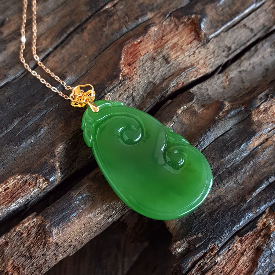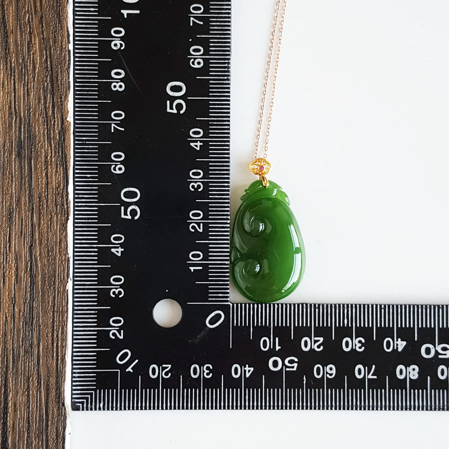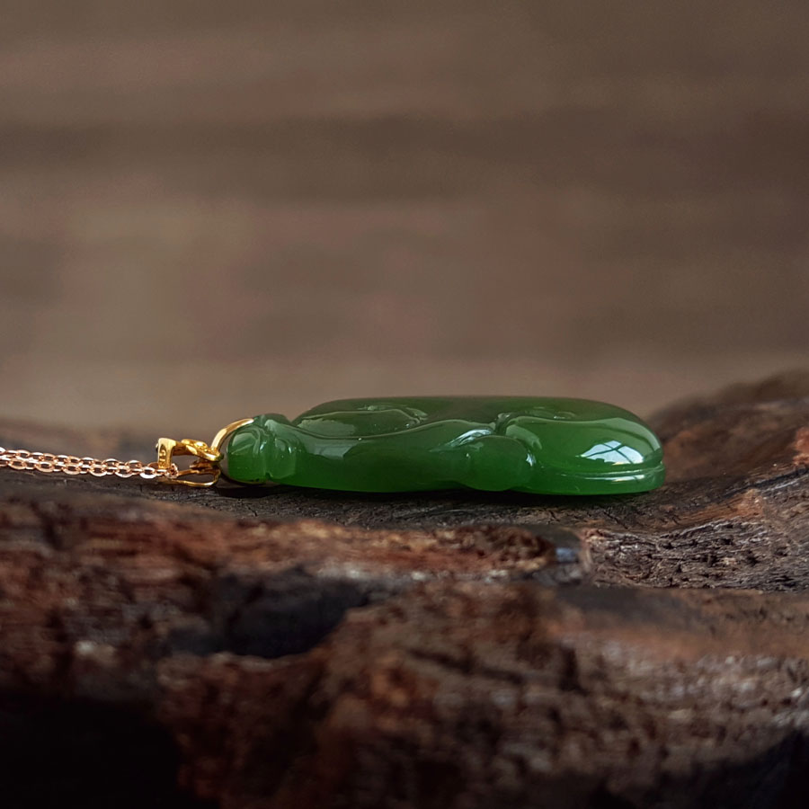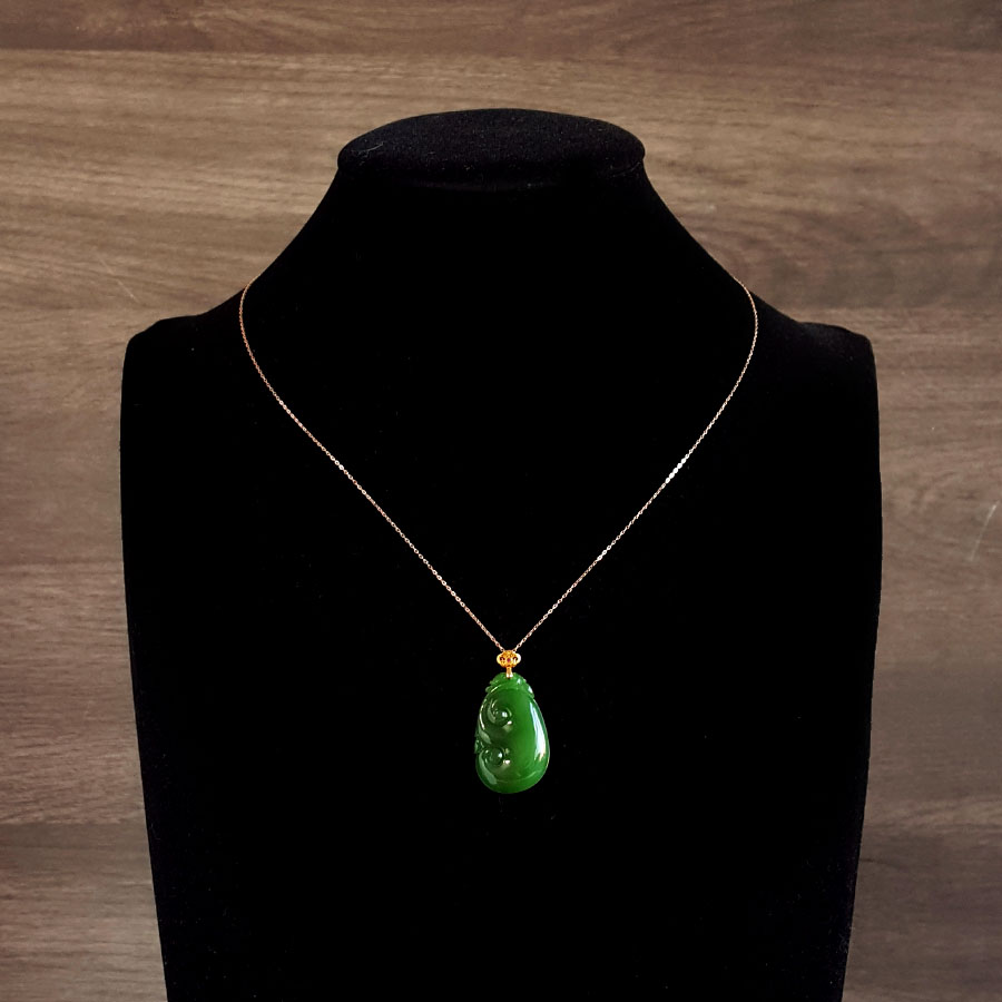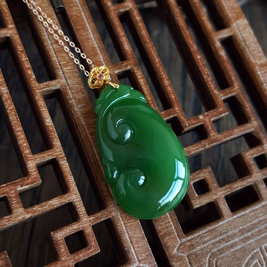 名称 | AU750黄金镶天然细腻菠菜绿无黑点如意(万事如意)和田玉碧玉吊坠项链 |