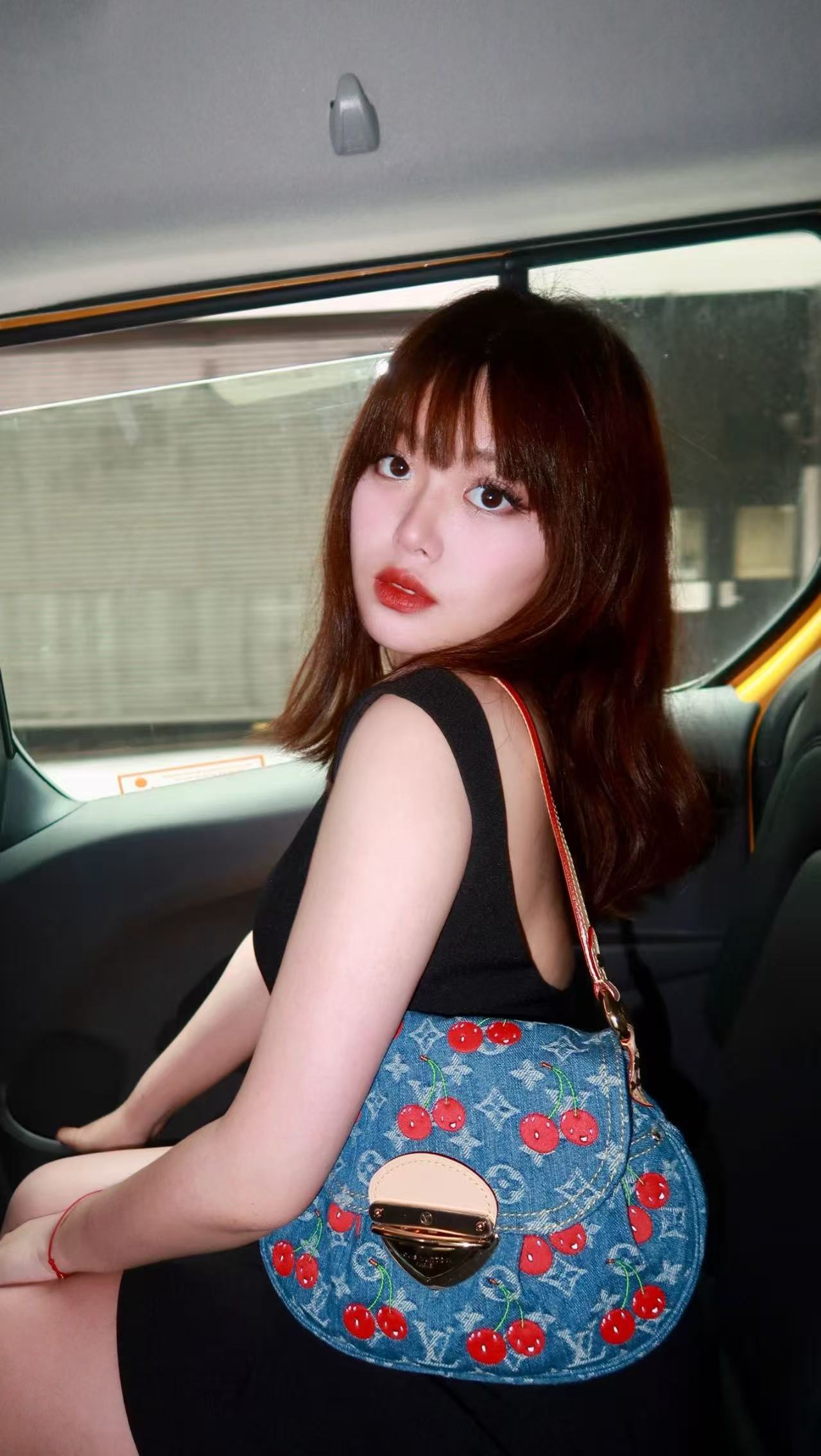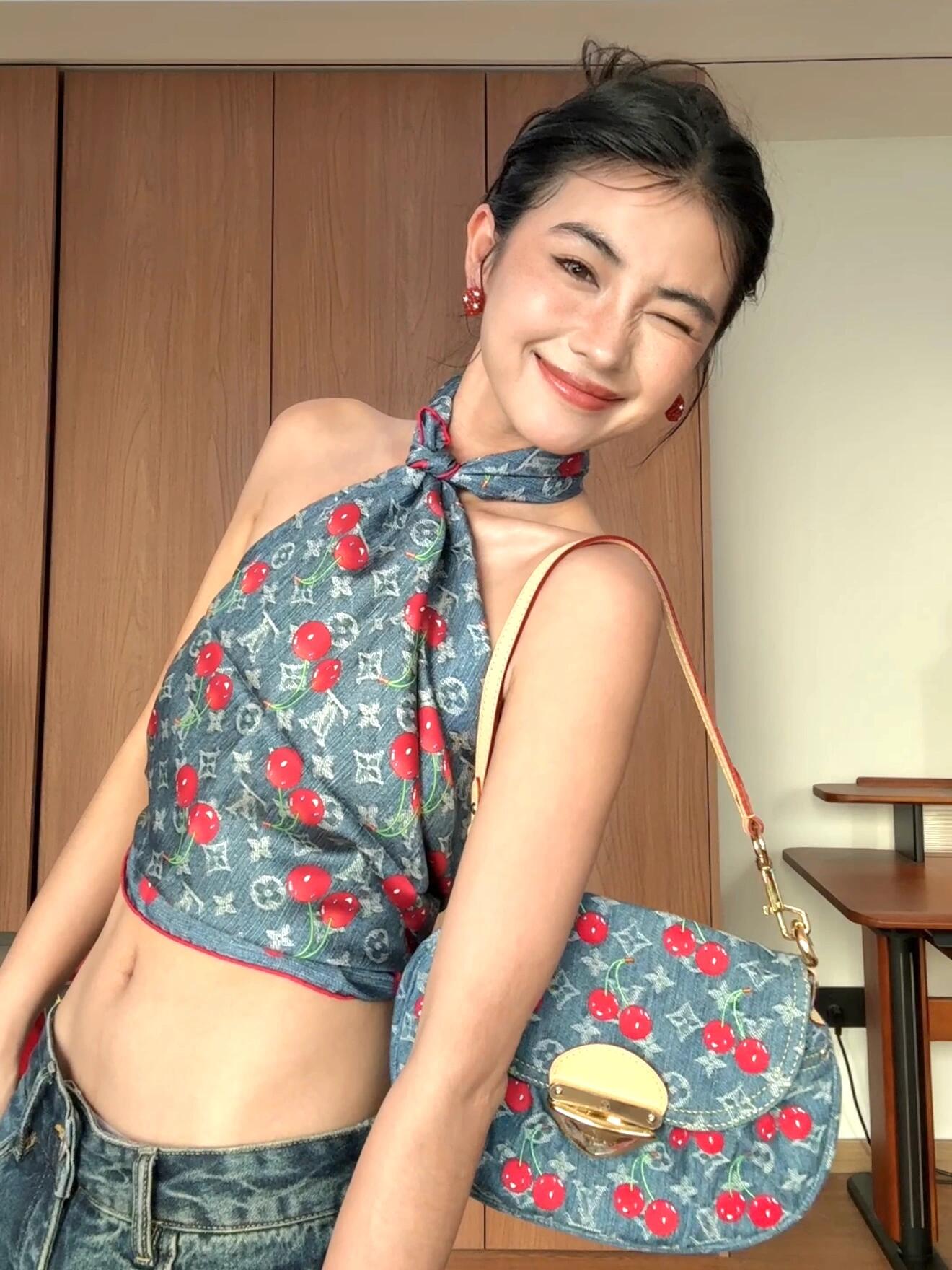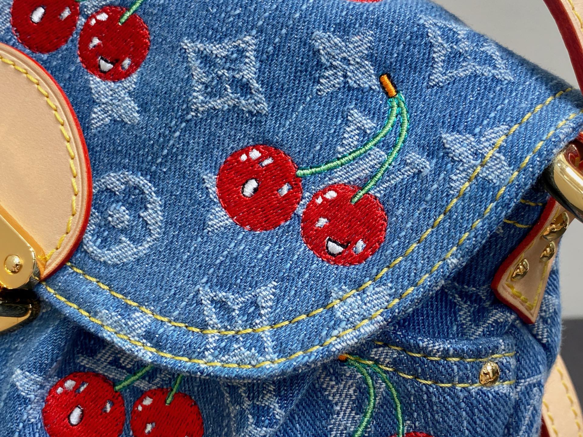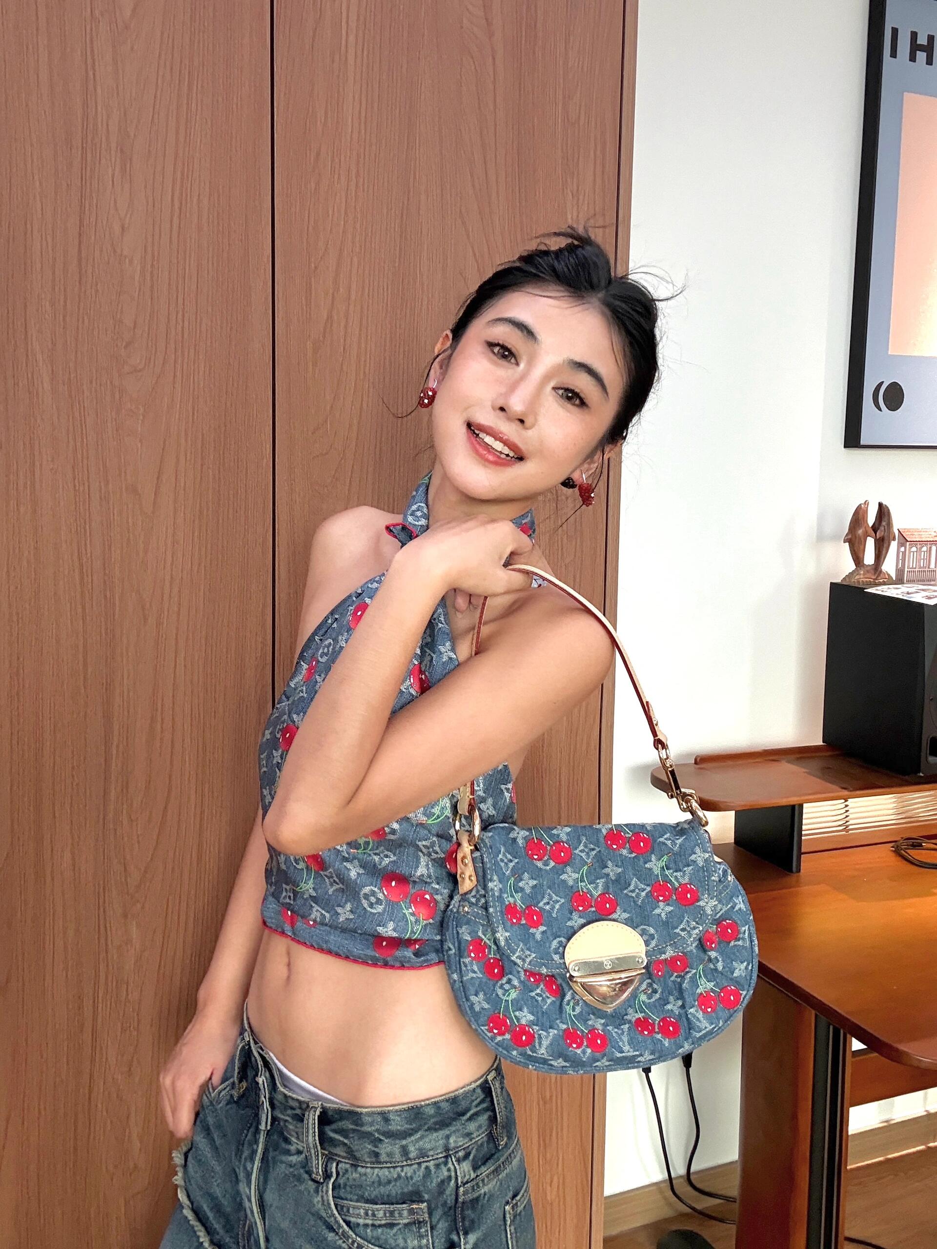 M13680蓝色丹宁牛仔 刺绣樱桃腋下包 X x TM SUNSET 手袋 Monogram Cherry cc丹宁织物牛皮革饰边棉质织物内衬金属件插扣外贴袋内贴袋可收纳智能手机、耳机、Zippy长款钱夹和钥匙肩带:可拆卸,可调节包带半长:23.0厘米 包带半长可调至:48.5 厘米,27 x 18 x 3厘米(长度x高x宽)
