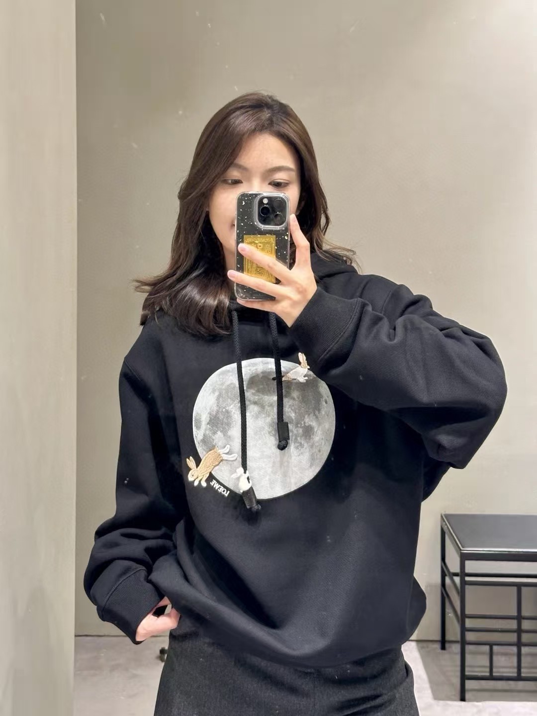 ⚠️原¥10,900购买;轻盈棉质抓绒连帽卫衣、饰有月亮印花、胸前小兔图案刺绣卫衣为合作系列作品、连帽宽松版型、标准长度、罗纹袖口和下摆、抽绳饰有黄铜和珐琅小兔挂饰、以及 Anagram 刺绣