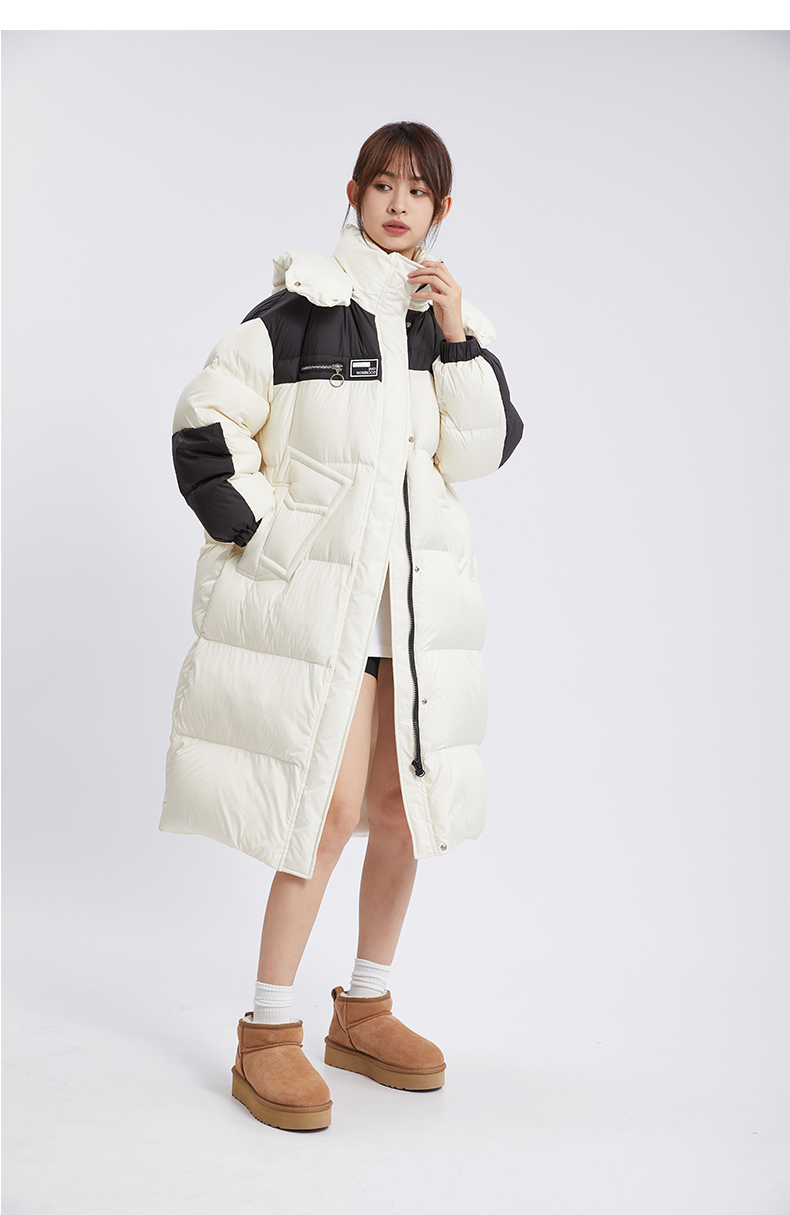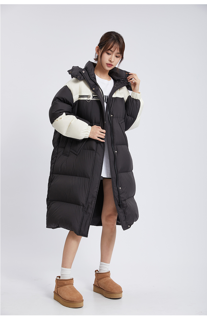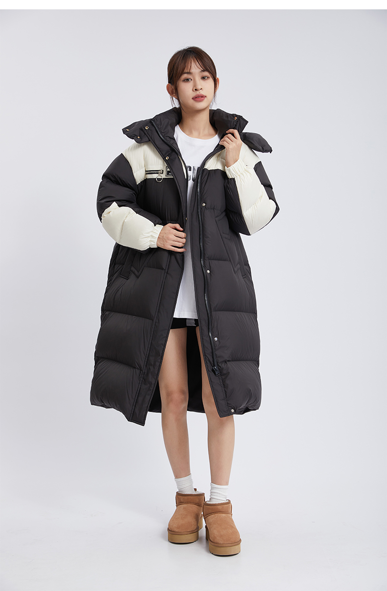 ROBINHOOD撞色拼接长款羽绒服时尚百搭H版型显瘦-R238Y6964(黑色)