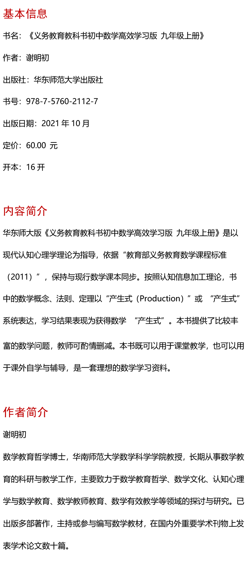 义务教育教科书初中数学高效学习版 九年级上册 初三数学 教参教辅 课后习题 谢明初主编 正版 华东师范大学出版社