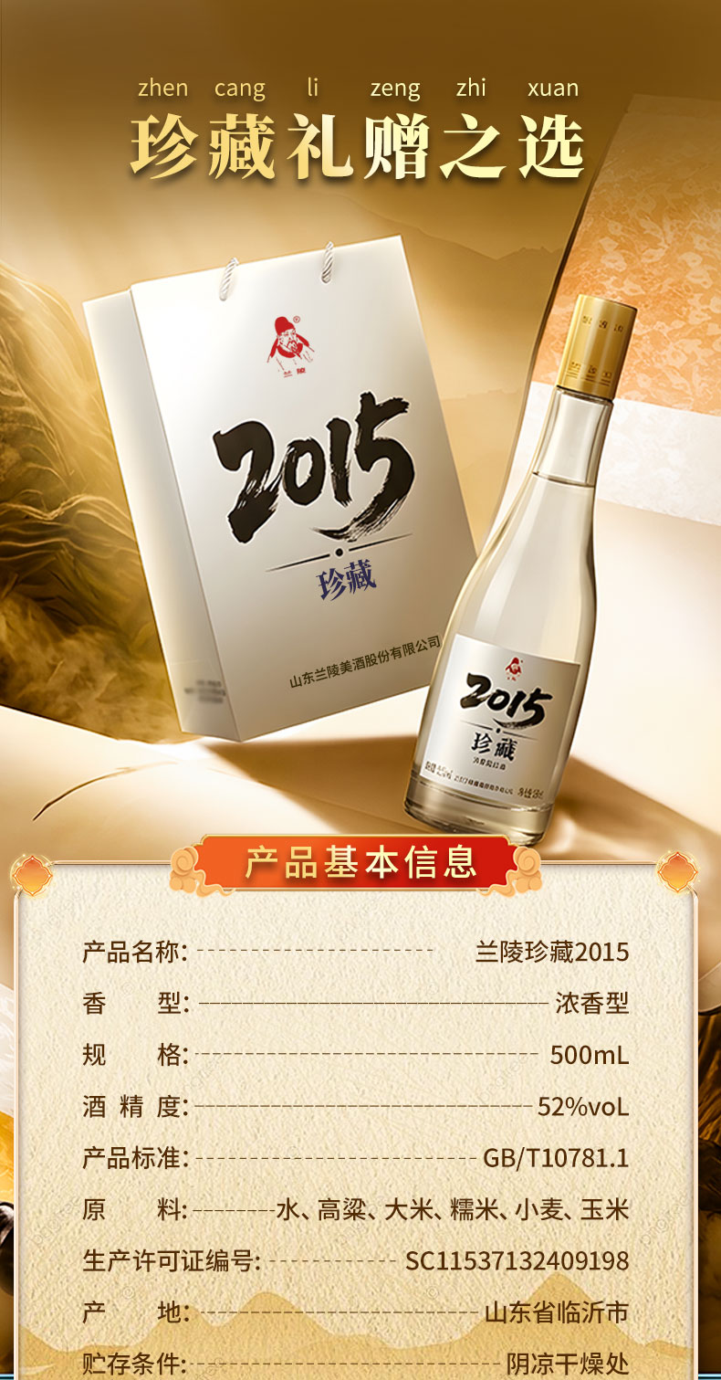 兰陵珍藏 52度优级浓香型白酒500ml*2瓶 纯粮酿造