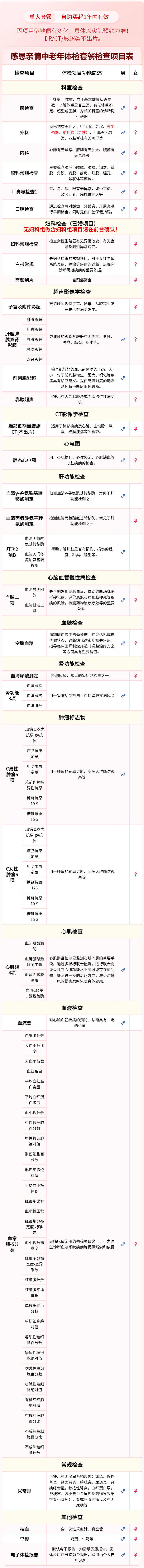 总体来说,这款针对中老年群体的套餐有常见肿瘤筛查,也有部分脏器彩超的相关检查,若想了解该体检所有检查项目,可参见下方表格。