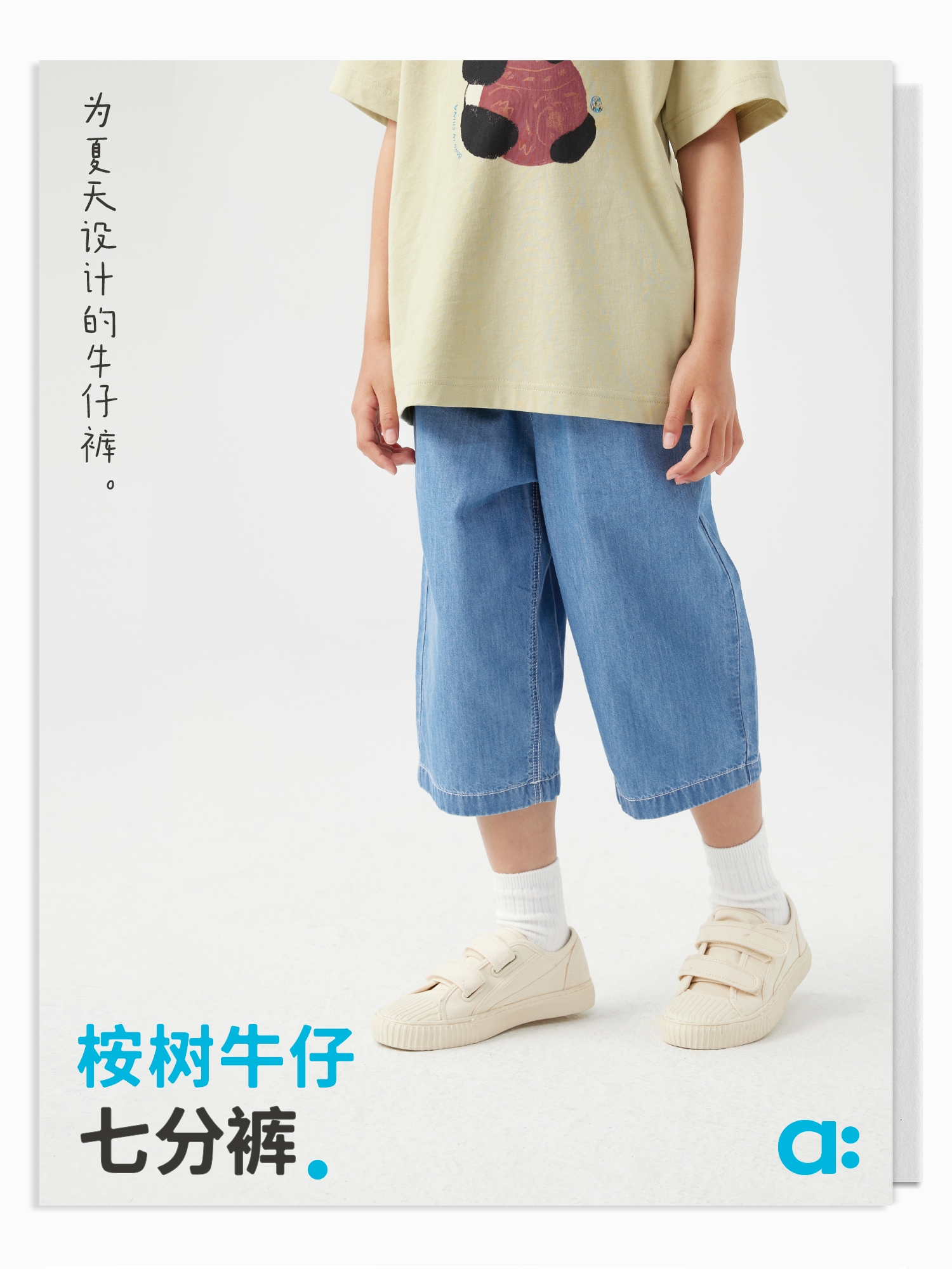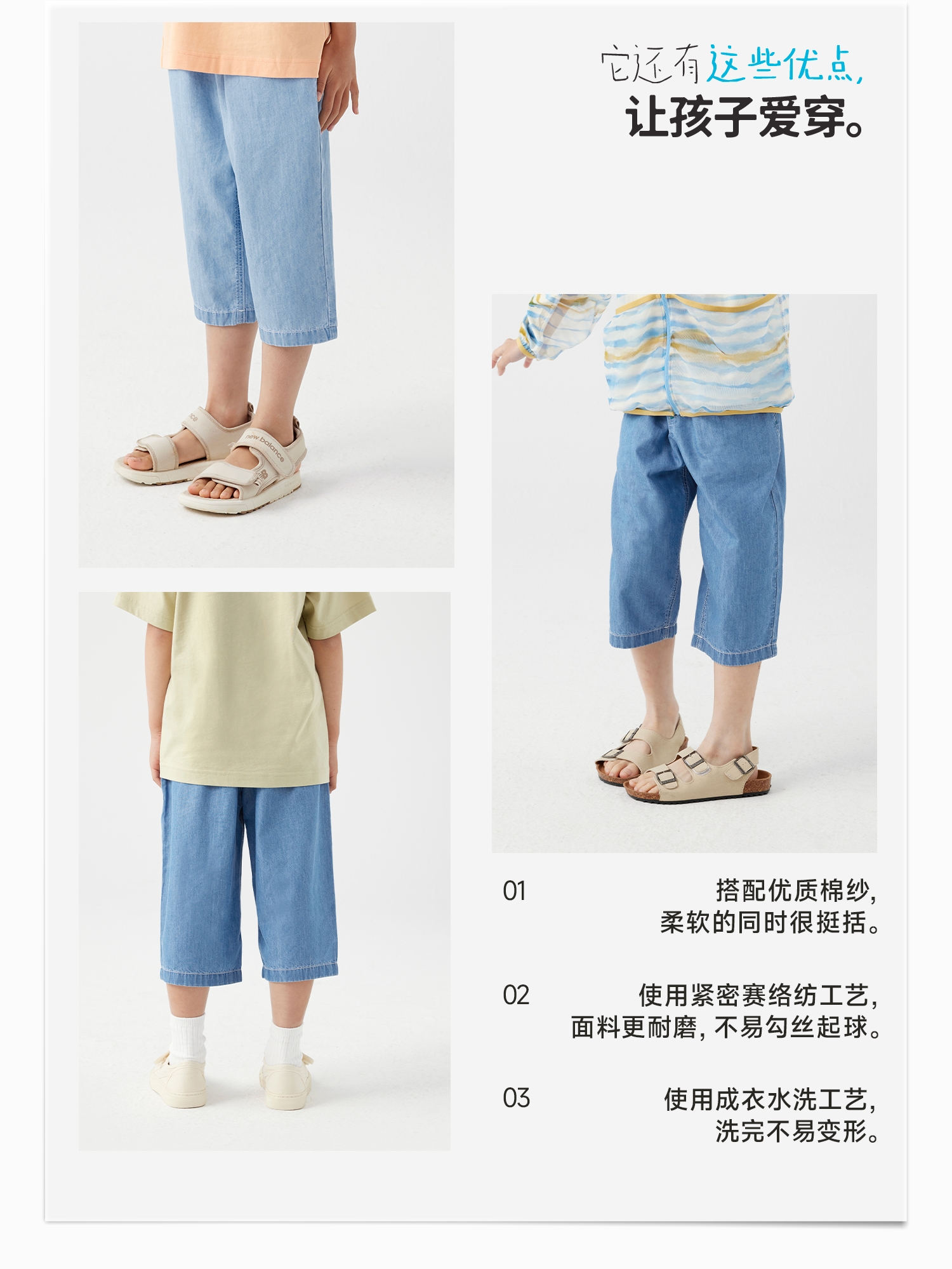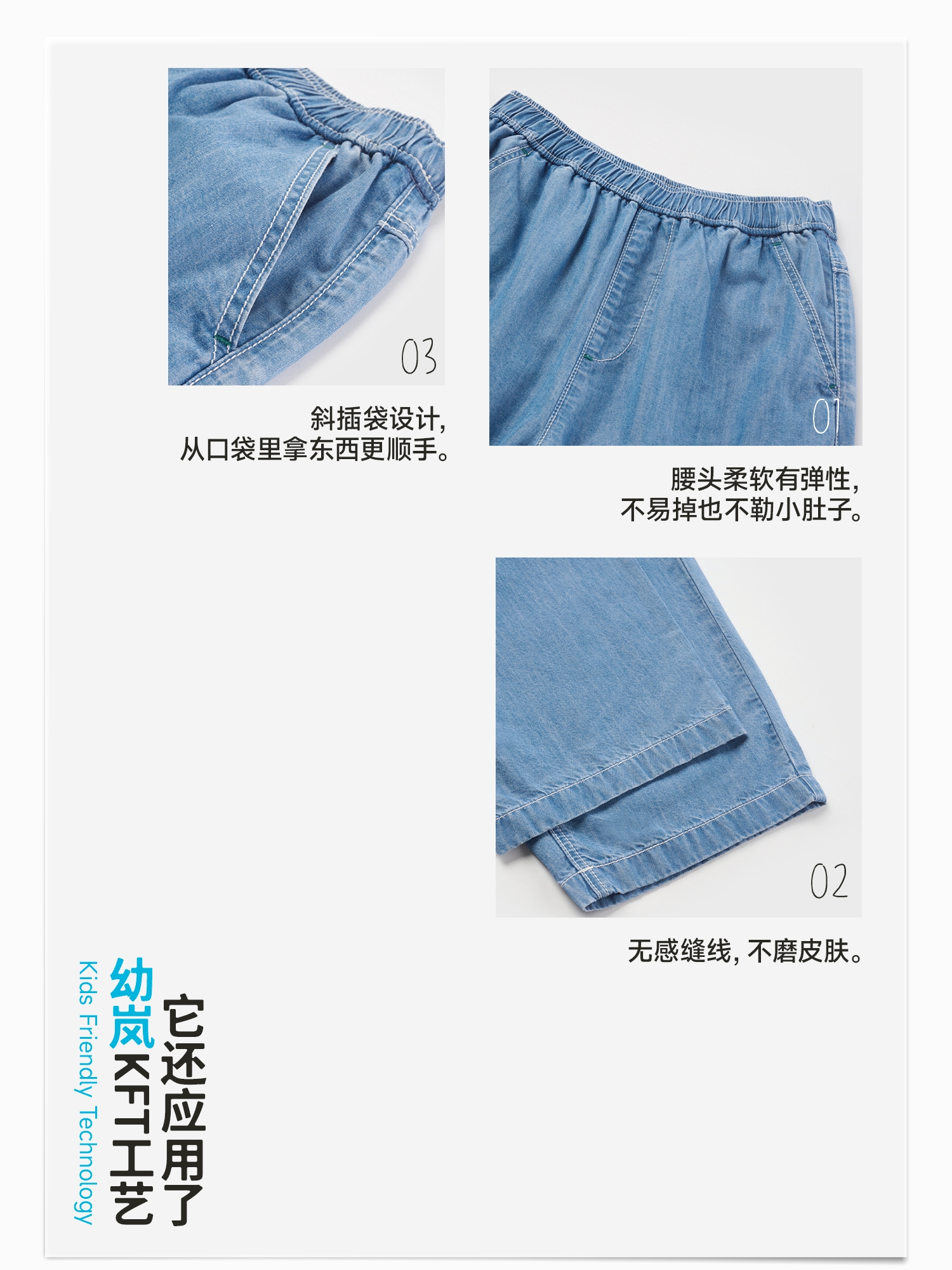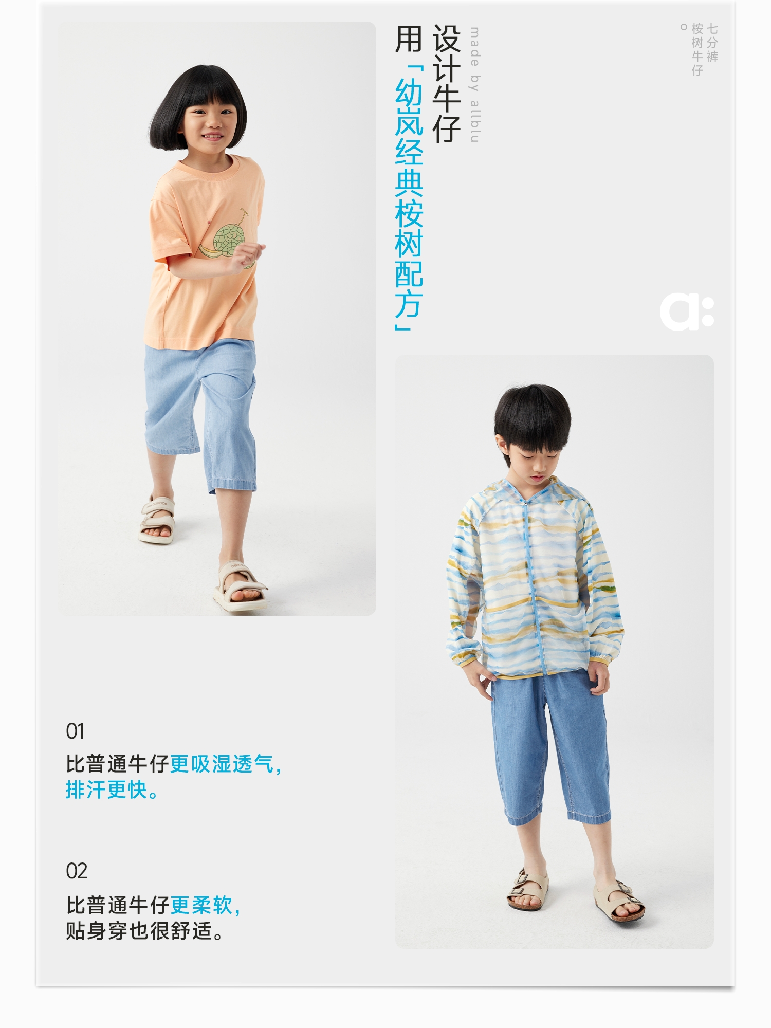 【好友特惠】幼岚「王牌桉树皮」牛仔七分裤透气排汗24夏儿童柔软贴身易打理牛仔裤ZY