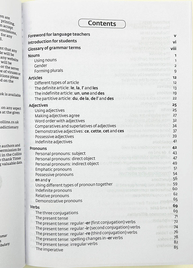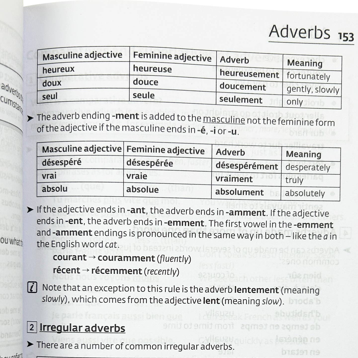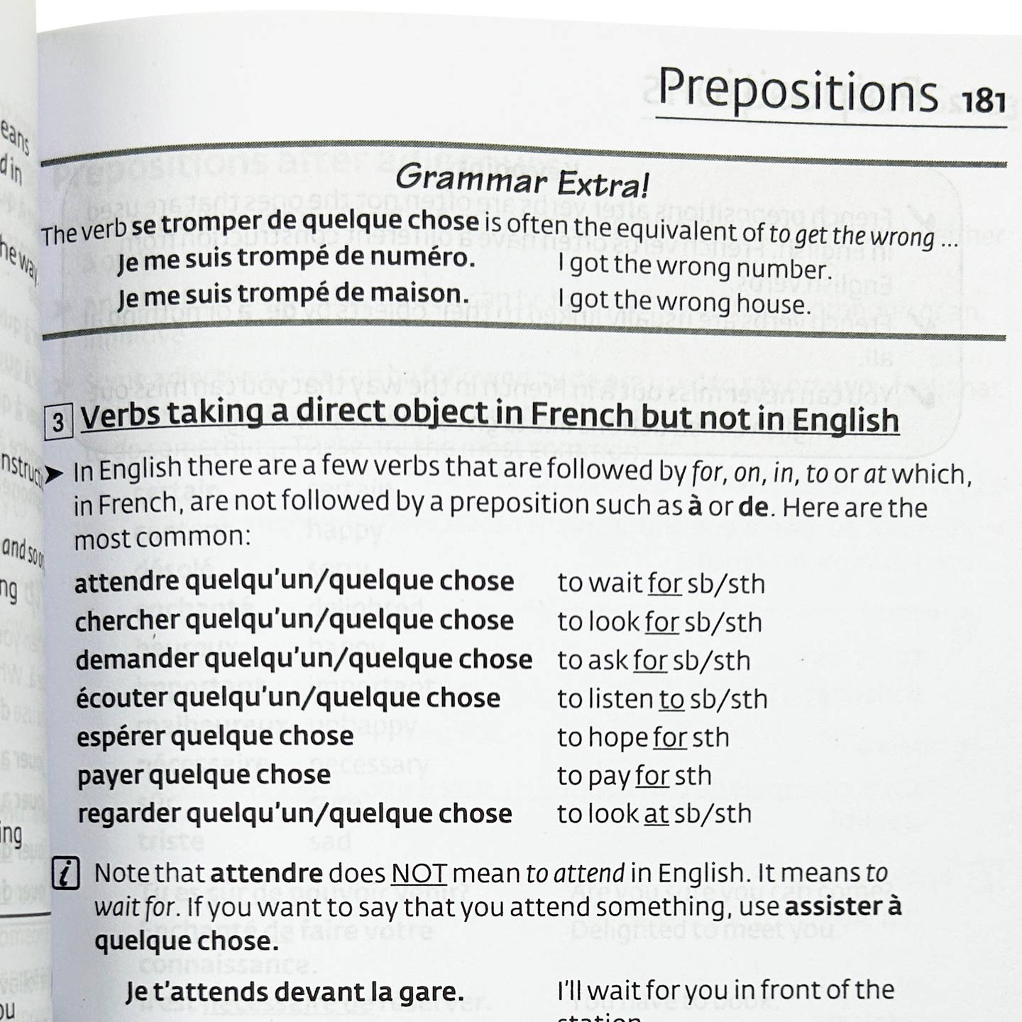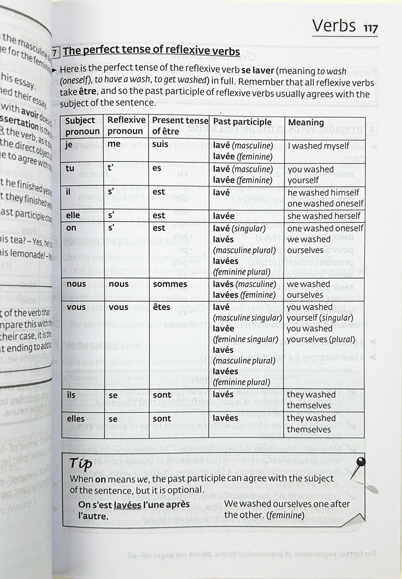 •Verbs: you will find 112 fully conjugated regular and irregular verbs in this section. Each is self contained in a double-page spread showing all the major tenses. Major constructions and idiomatic phrases are given for all verb models, as well as hundreds of examples of real French to show you how verbs are used in context . An index contains thousands of verbs which are cross-referred to their conjugation model.