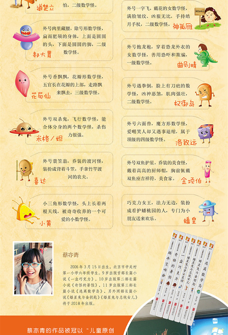蔡亦青,在6岁时已独立创作童话故事30多篇,9岁出版首部长篇小说《一盒巧克力》,10岁出版第二部长篇小说《奇怪的暑假》,11岁出版第三部长篇小说《逃离数学岛》,另外两部长篇小说《蟠星兔与金钥匙》《蟠星兔与总统女儿》将于2018年出版。