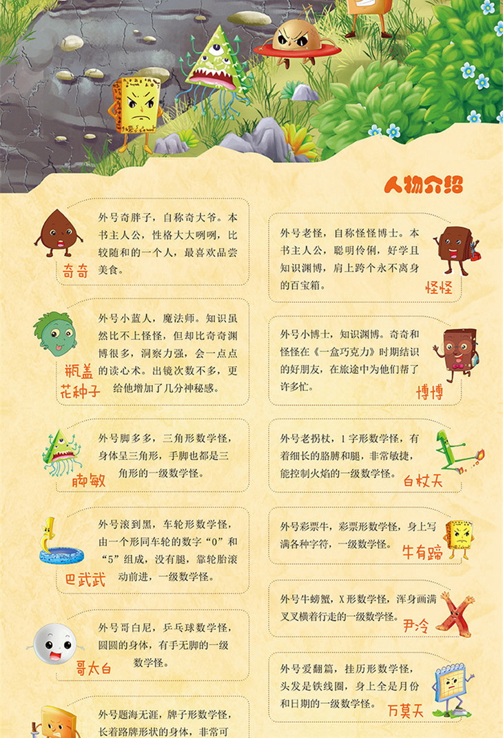 作者在本书中塑造了众多数学怪的形象,这些怪物不仅有稀奇古怪的相貌,还有令人捧腹的名字和外号,这也让奇奇饶有兴趣,在恐怖厮杀的间隙,也从不忘记要寻问怪物的名字,让人忍俊不禁。