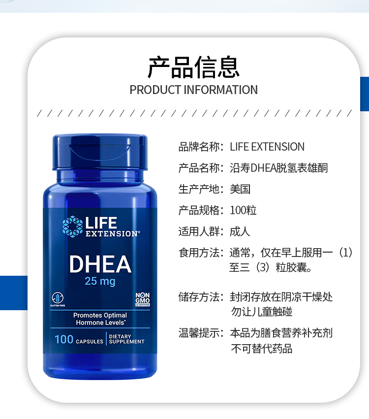 【香港直邮】沿寿Life Extension DHEA 25mg 100caps脱氢表雄酮胶囊100粒