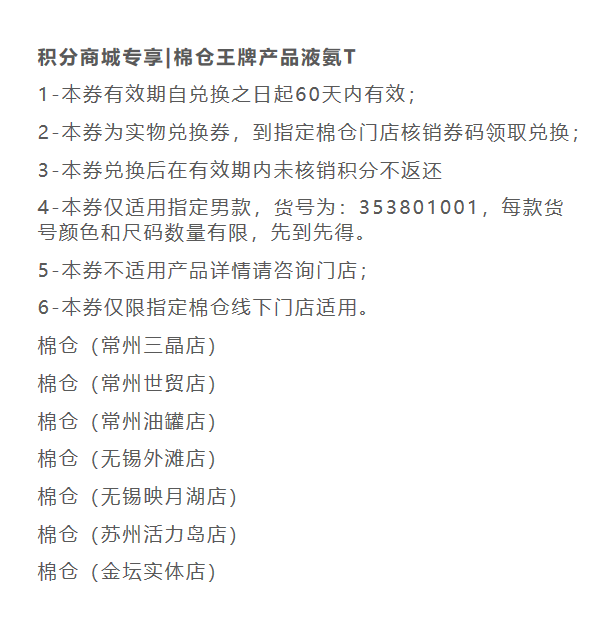 积分兑换专享|棉仓特产王牌产品·男款液氨T(需到门店兑换)