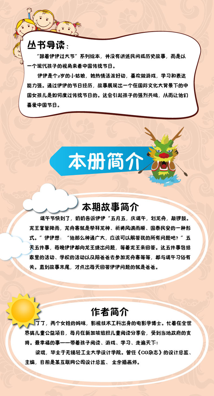 伊伊是个5岁的小姑娘,她热情活泼好动,喜欢做游戏,学习和表达能力强。通过伊伊的节日经历,故事展现出一个在国际文化大背景下的中国女孩儿是如何度过传统节日的。这会引起孩子的强烈共鸣,从而让他们喜爱中国节日。