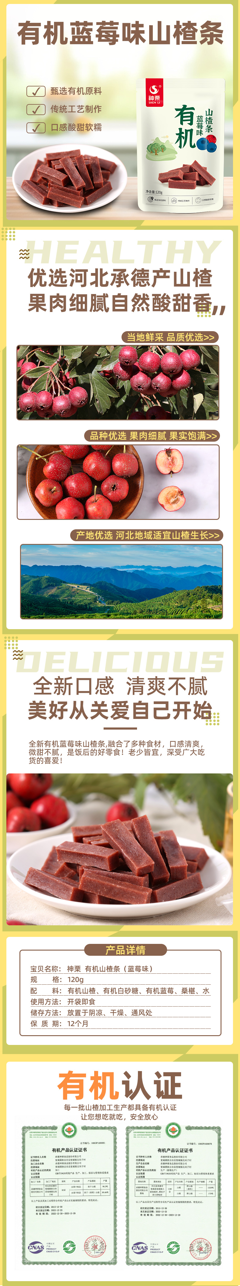 神栗有机蓝莓味山楂条办公室零食果丹皮蜜饯休闲独立包装120g*3