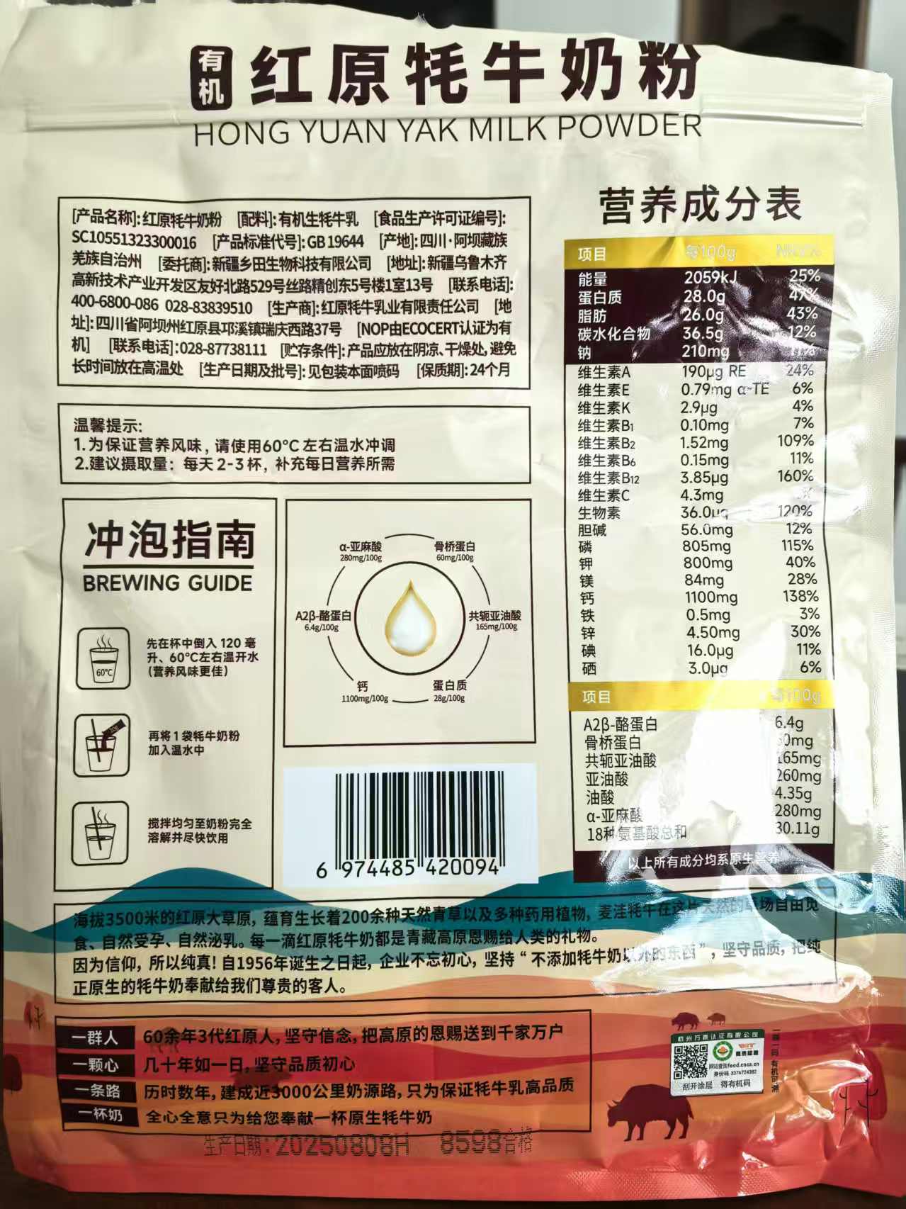 【2025年8月生产】【全新定制,升级加量不加价】国家地理标识产品【红原有机牦牛奶粉,500g*1袋】世界三大洲权威机构有机产品认证 无添加 无激素 有机牦牛奶粉