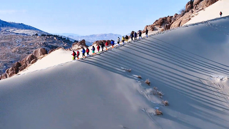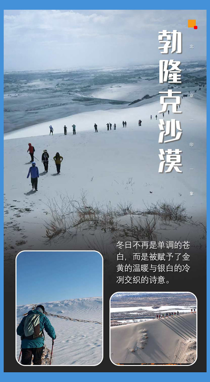 - 早餐后我们前往勃克隆沙漠轻徒步。此线路不进景区,徒步穿越沙漠活动,用脚丈量沙漠,用心行走天际,冬季(通常为11月至次年3月)的勃隆克,褪去了旅游旺季的喧嚣,展现出一种苍凉而纯净的极致之美。