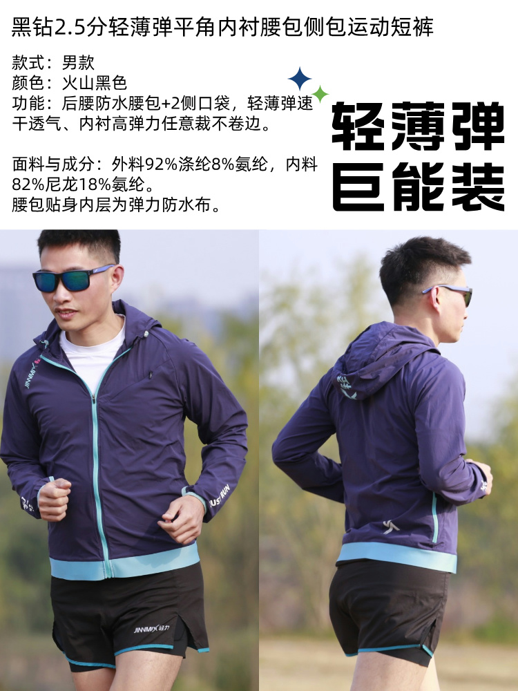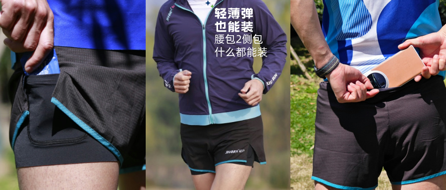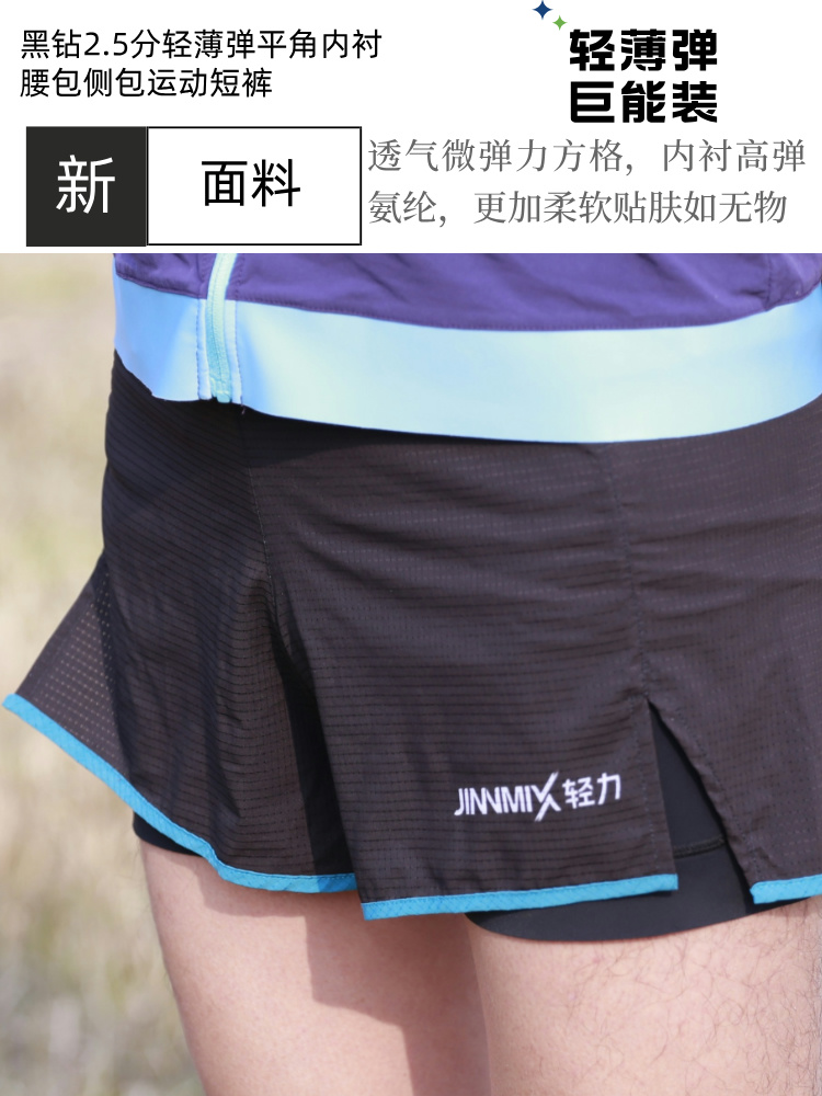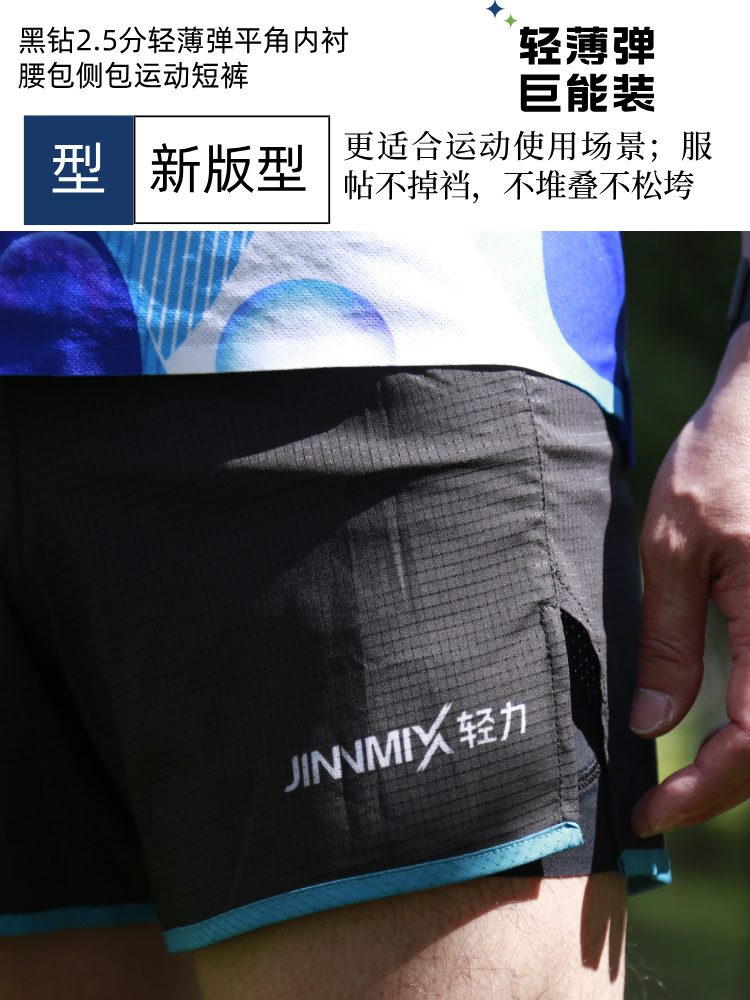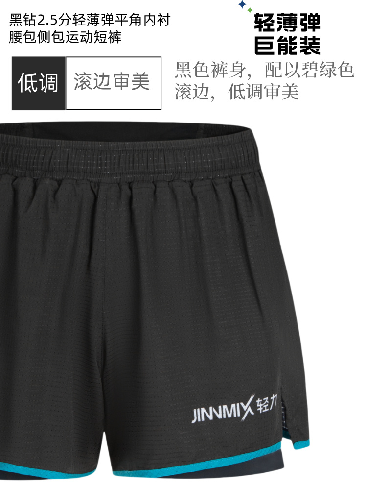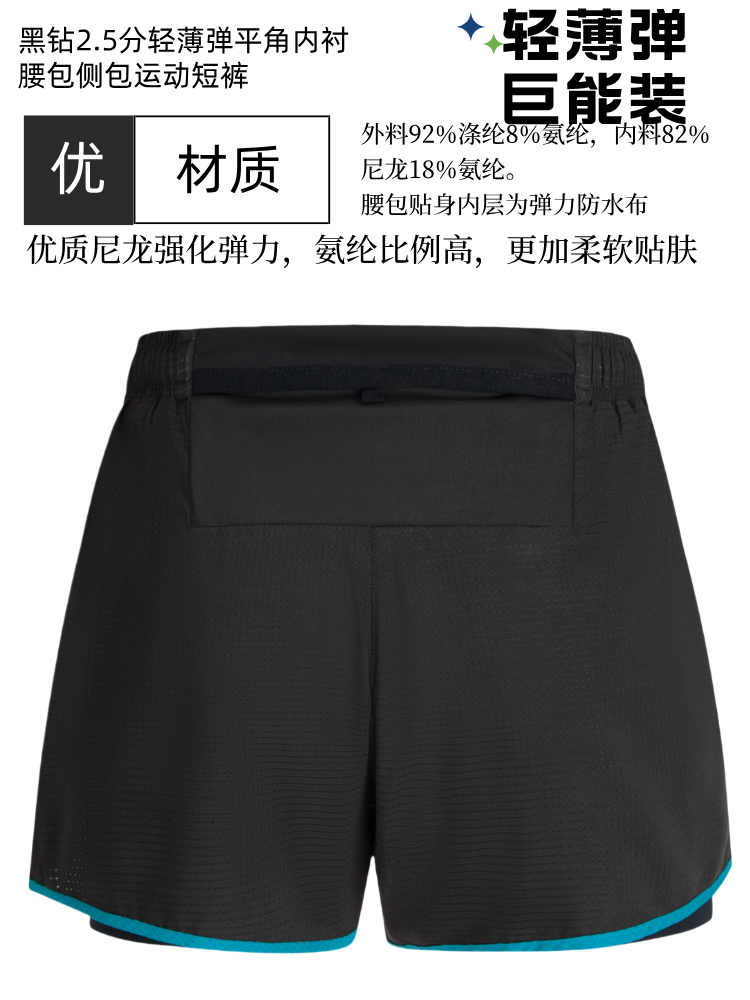 黑钻2.5分轻薄弹平角内衬腰包侧包运动短裤