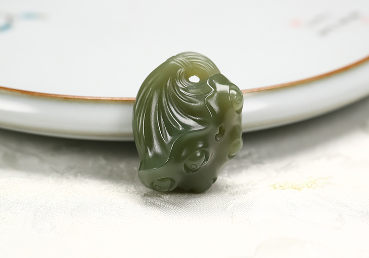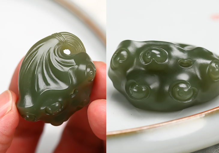 未经沁染青花色的沙枣青,玉色玉质如细腻豆沙,触感油糯。