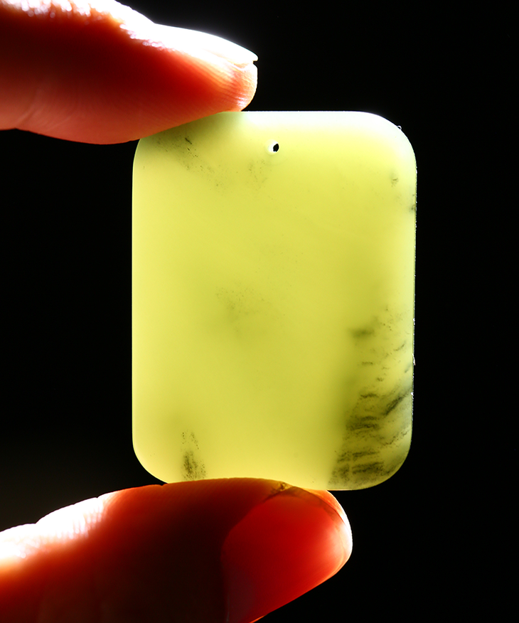 这块沙枣青玉牌,玉质细如绸,润似膏。