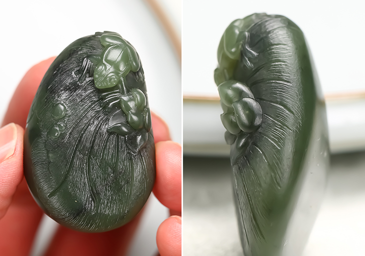 依玉随形,巧琢莲蓬之态:莲房饱满丰隆,孔窍圆融贯通,颗颗莲子若隐若现。
