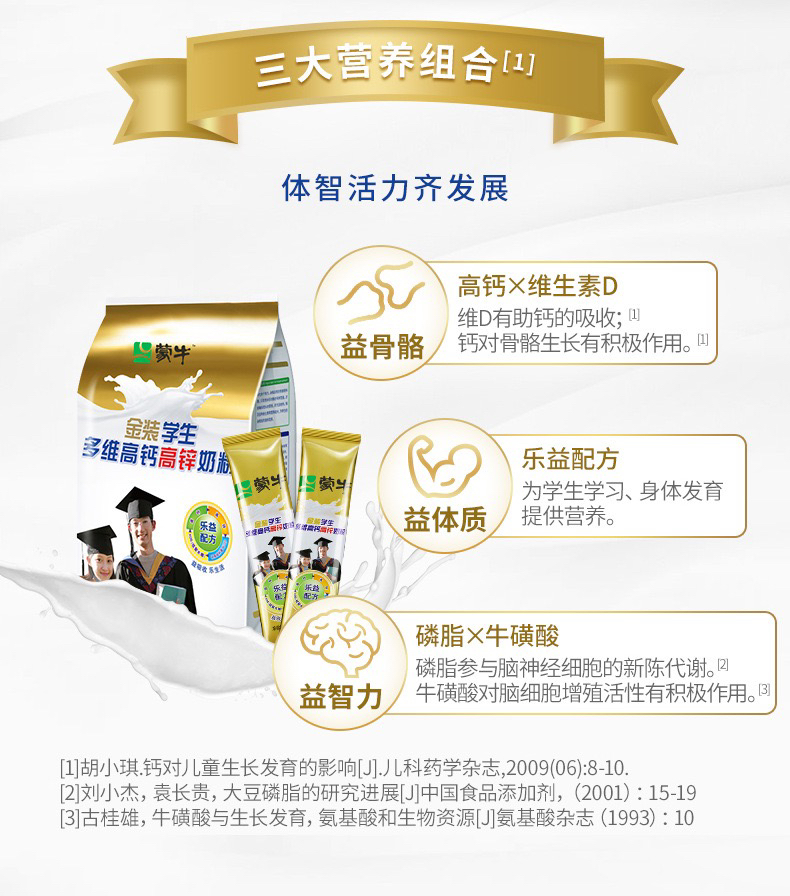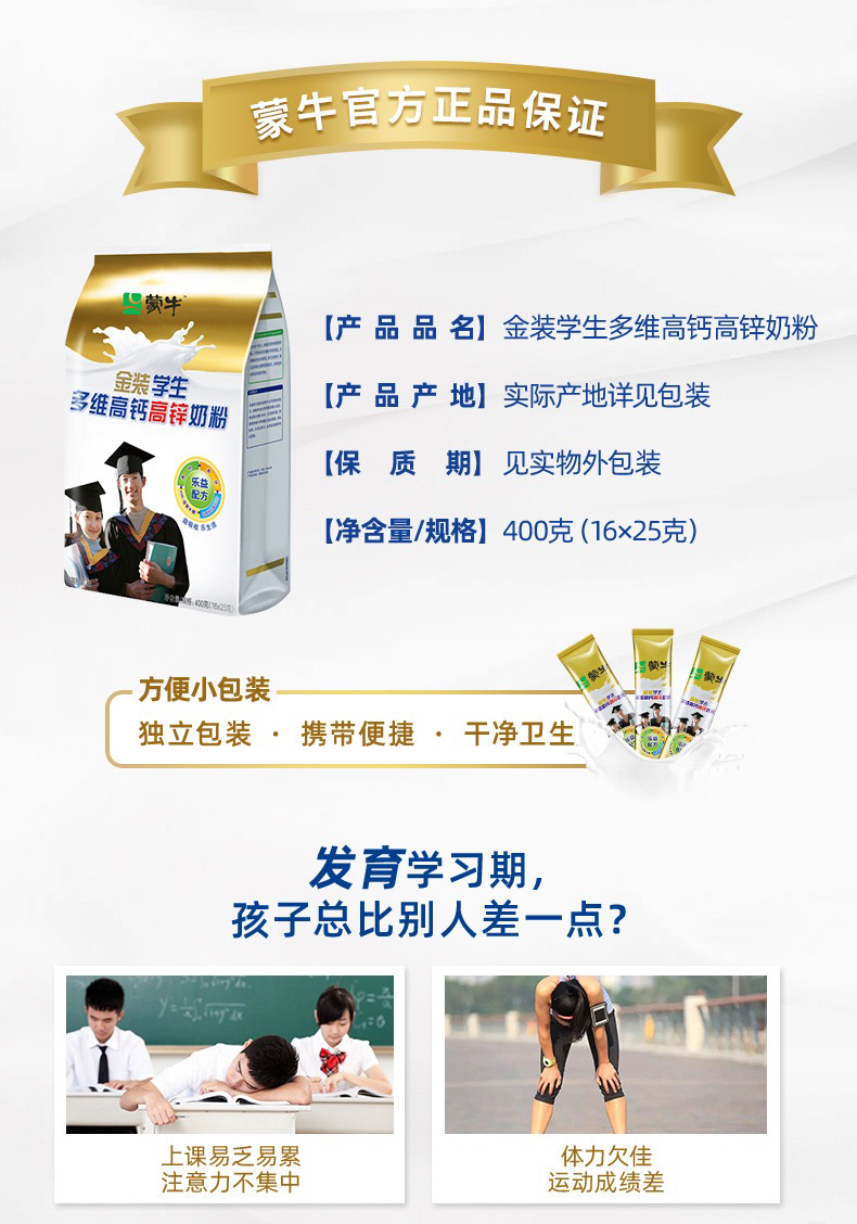 蒙牛金装学生多维高钙高锌奶粉400g袋装
