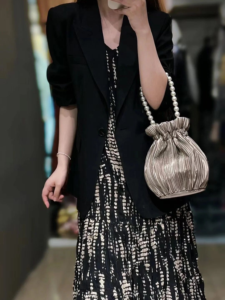 这款小黑裙采用意大利压褶工艺,走动时裙摆会随光线变幻出3D立体黑金波纹,如同把T台上的光影艺术穿在身上。