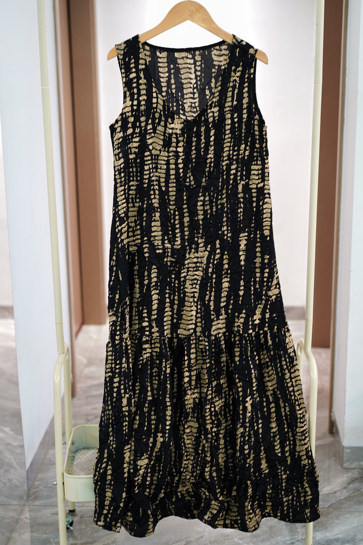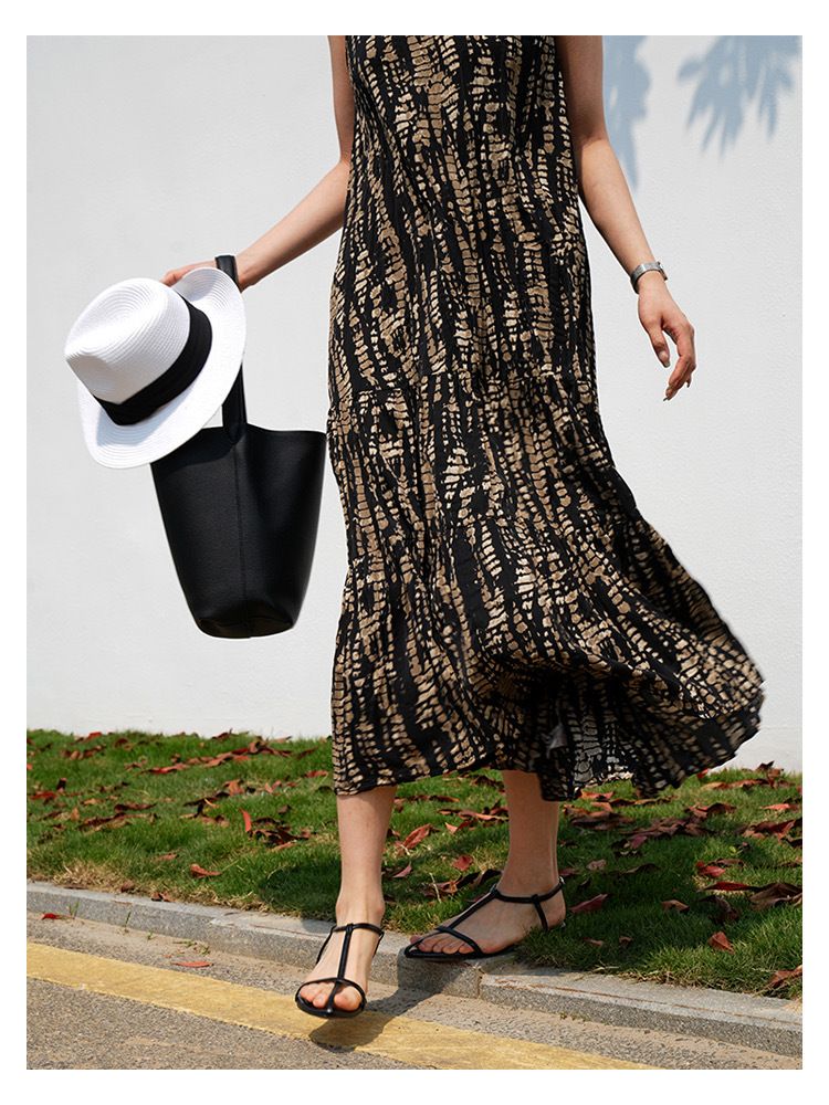 采用意大利压褶工艺,走动时裙摆会随光线变幻出3D立体黑金波纹,如同把T台上的光影艺术穿在身上。