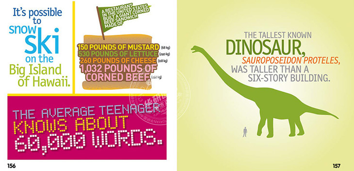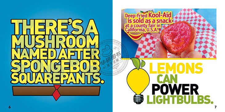 “Weird but True”系列丛书的内容精选自美国国家地理受欢迎的“小朋友”系列杂志的专题,有着全新的插图,创造性的分类方法以及丰富的图片,内容涵盖科学、地理、动物、食物、天气、流行文化乃至外太空,从世界大的肥皂泡到海王星上的风速,包罗万象,每次翻页都是一种乐趣,书中有趣的题材不仅让孩子认识到生活中的新鲜事物,更能激发他们的好奇心,培养其自主学习的意识。