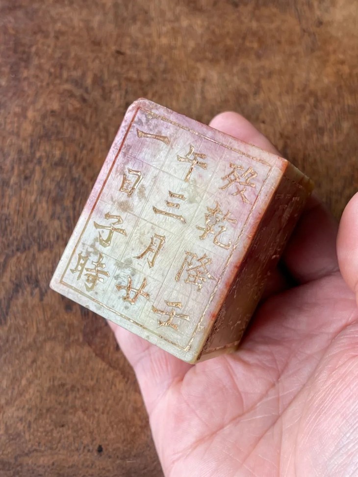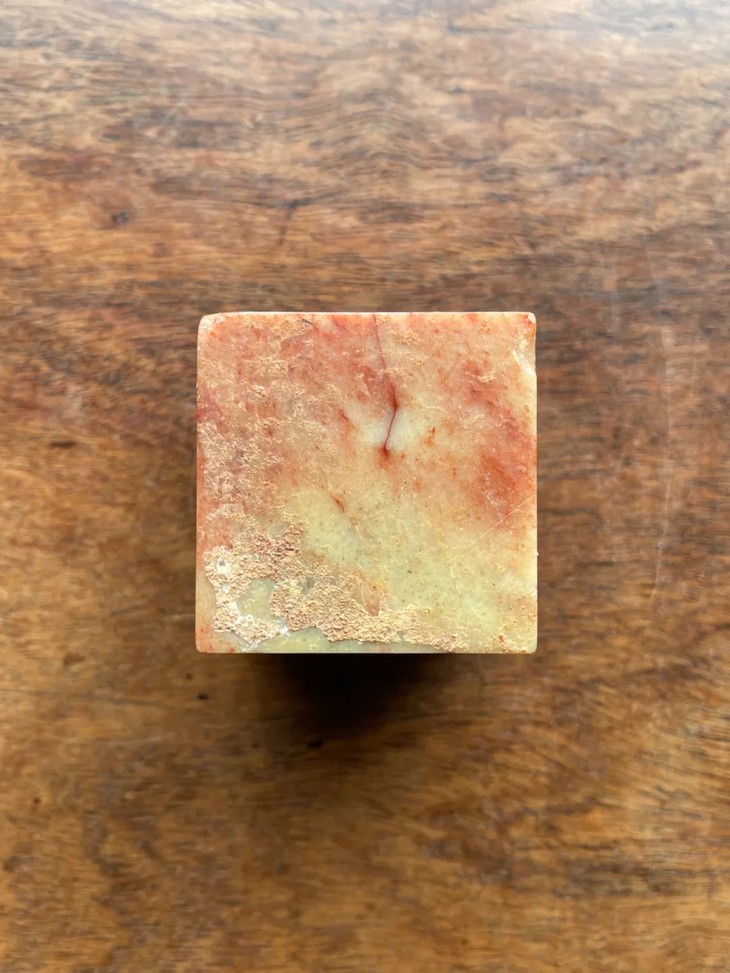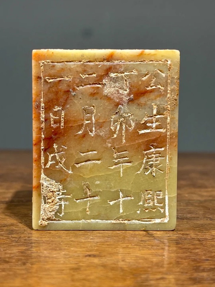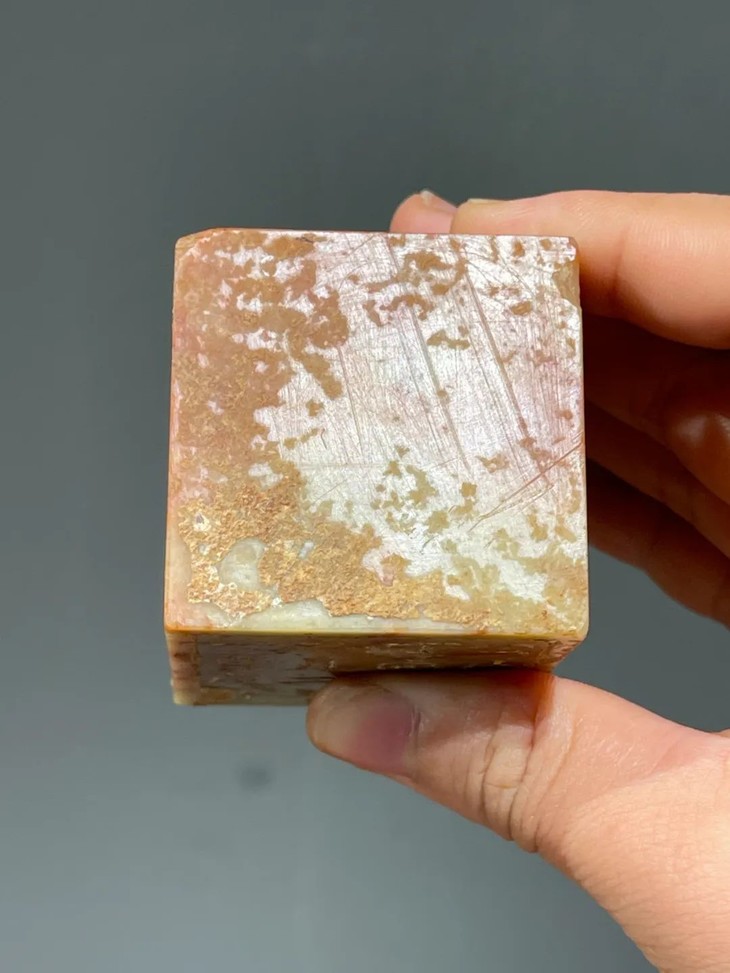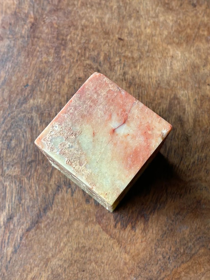 这是一方以产于福建寿山的芙蓉朱砂石雕刻名人祭禱文的石碑,此类用料讲究,雕琢精緻的祭文碑供奉于祠堂以纪念先人。採用整块寿山将军洞带朱砂斑芙蓉石所雕琢而成的正方块,石质淡黄底艳丽红斑,老包浆皮壳温润细腻,具多年埋藏积垢,四壁刻阴文与阳文之先人生平:“康熙癸巳舉人授内閣中書雍正甲辰進士 應公諱文字雲素號質堂派銘行三十二 公生康熙丁卯年十二月二十一日戌时 殁乾隆壬午三月二十一日子时”