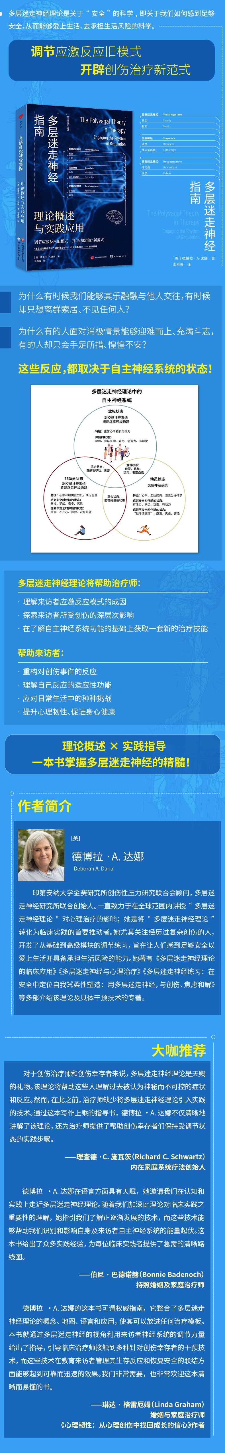 德博拉A. 达娜的这本书可谓指南,它整合了多层迷走神经理论的概念、地图、语言和应用,使其可以放进任何治疗模板。本书就通过多层迷走神经的视角利用来访者神经系统的调节力量给出了指导,引导临床治疗师接触到多种针对创伤幸存者的干预技术,而这些技术在教育来访者管理其生存反应和恢复安全的联结方面能够起到可靠而迅速的效果。我们非常需要,也非常欢迎这本清晰而易懂的书。