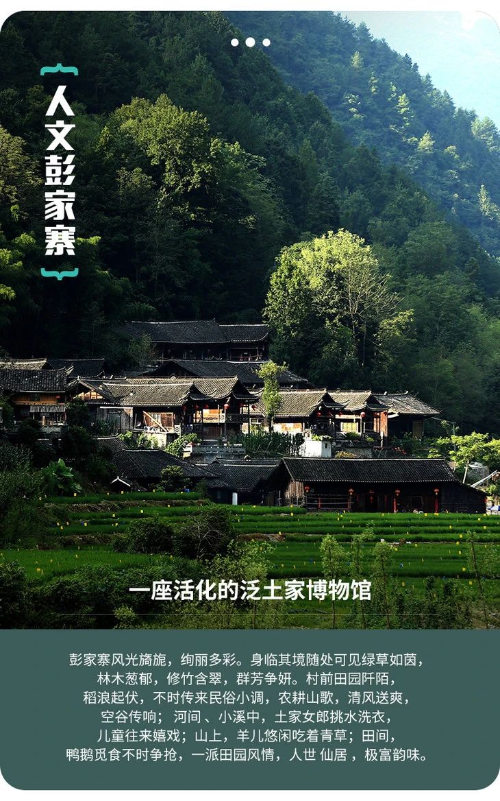 彭家寨坐落在湖北恩施土家族苗族自治州武陵山北麓的彭家寨。全寨50多户近300口人,均系土家族。彭家寨吊脚楼群依托观音山,建于山脚斜坡上,寨前是一排稻田,面向龙潭河,河上架有铁索桥。山清水秀,人杰地灵,古色古香,如同一颗璀璨的明珠,闪烁在宣恩县西南边陲。