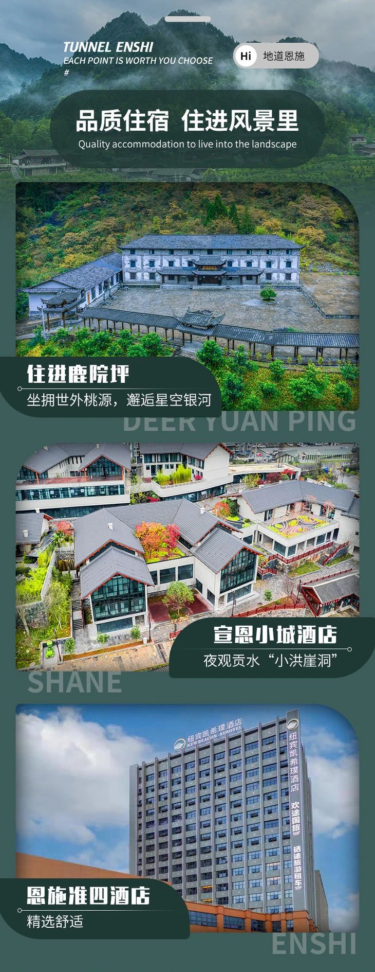 2.住宿:恩施准四酒店1晚,女儿城三星精选酒店(参考土家土居客栈)1晚、1晚鹿院坪硫年民宿或玄鹿客栈、宣恩县城准三酒店 1 晚;
