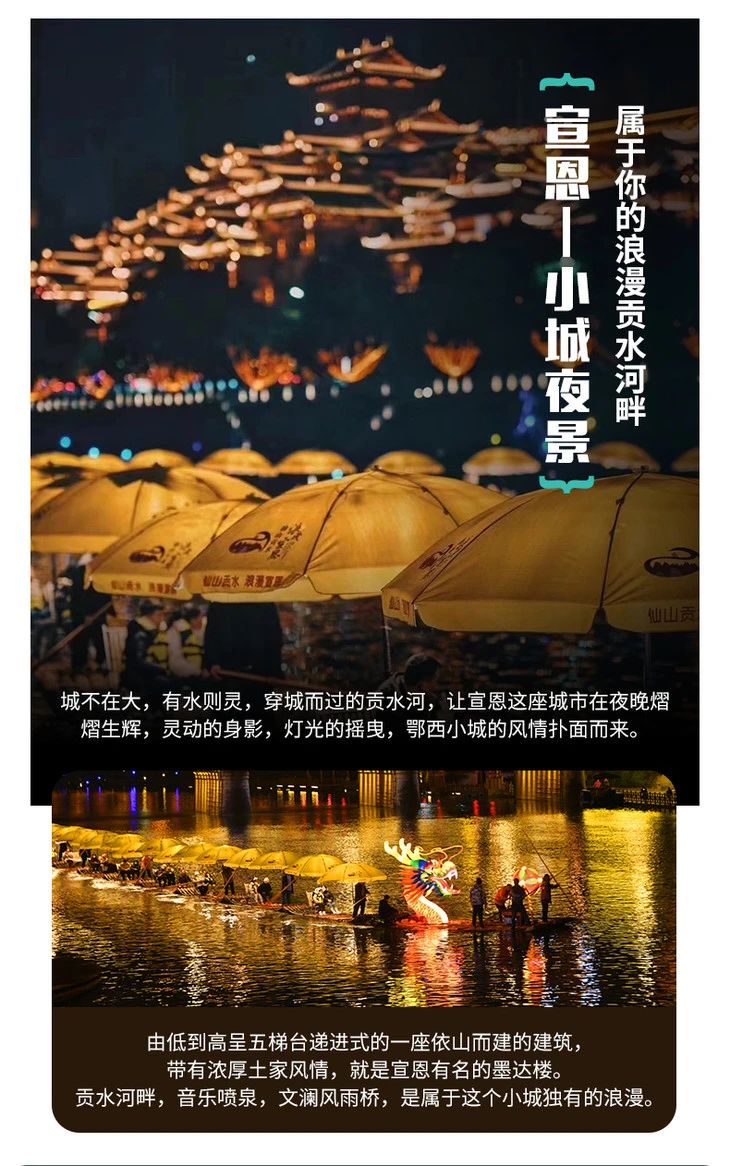 晚上,我们住在宣恩这个浪漫小城,可以去体验特色宣恩烤活鱼,再漫步贡水河畔,走上风雨桥,感受慢生活。