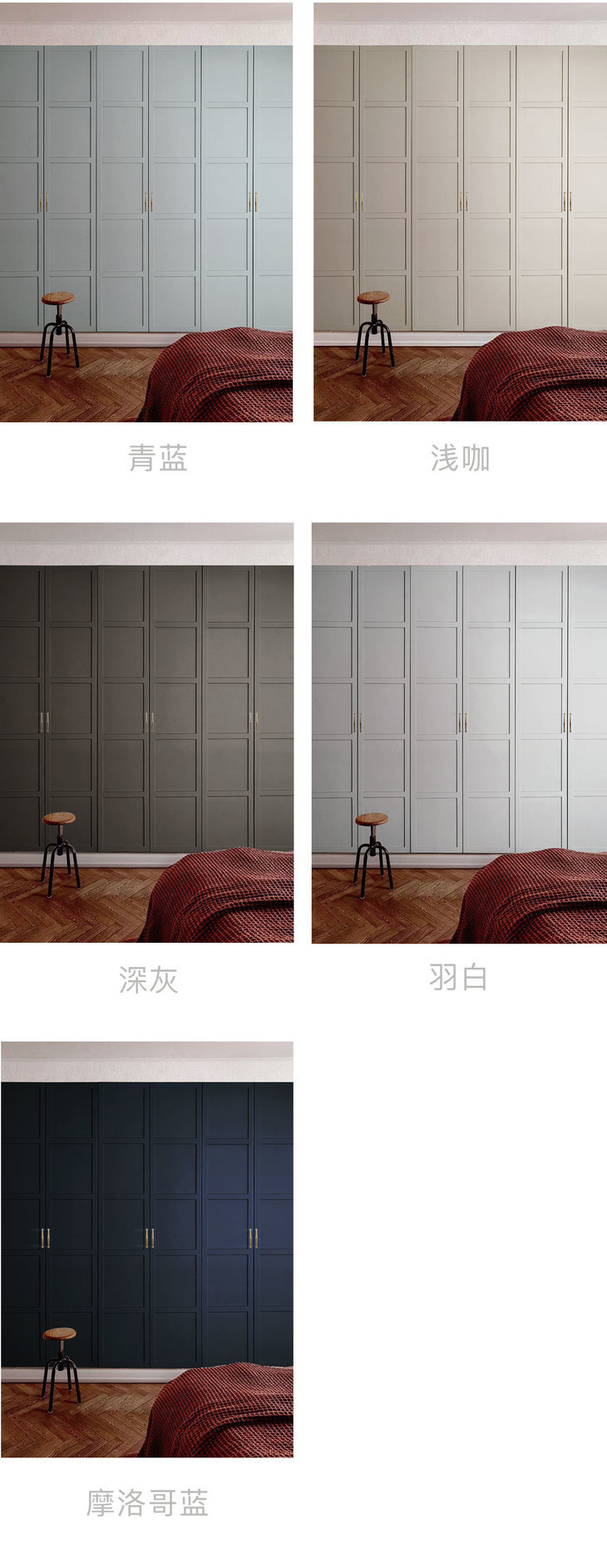 这也是一款平开门衣柜,门板是用德国雷诺丽特(Renolit)覆膜板,颜色分为6种。德国雷诺丽特(Renolit)是目前国内最好的吸塑膜品牌,质量超过国内常见的韩国LG吸塑膜和台湾好奇。这款门的彩色膜摸起来细腻滑润,非常高级。