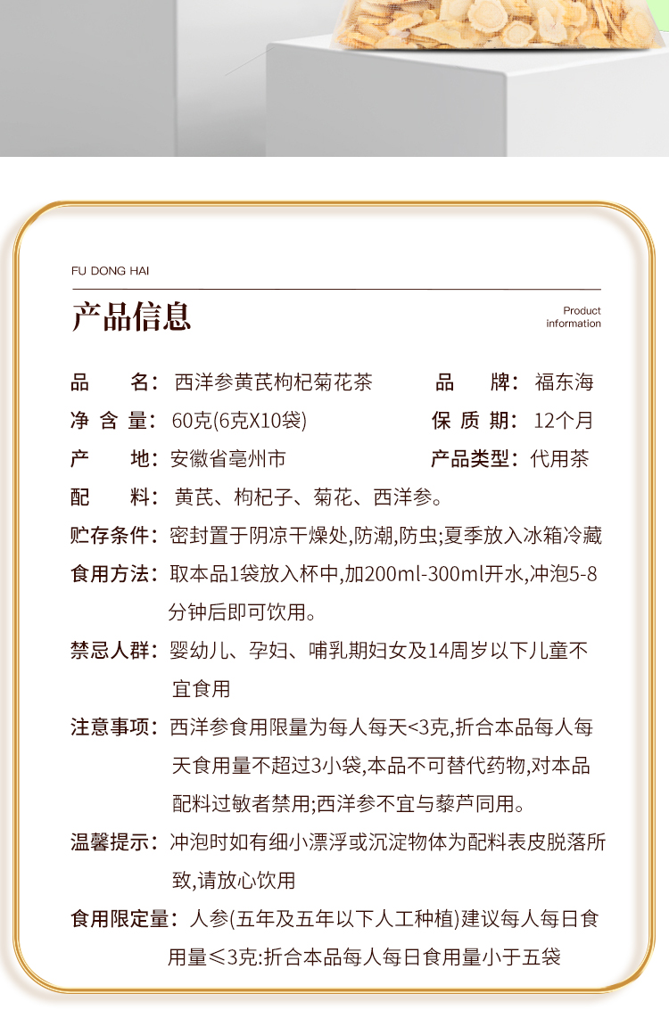 福东海 西洋参黄芪枸杞菊花茶60克(6g*10袋)泡水煮水熬夜救星养生茶包