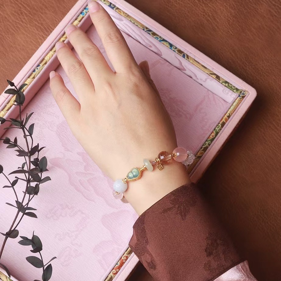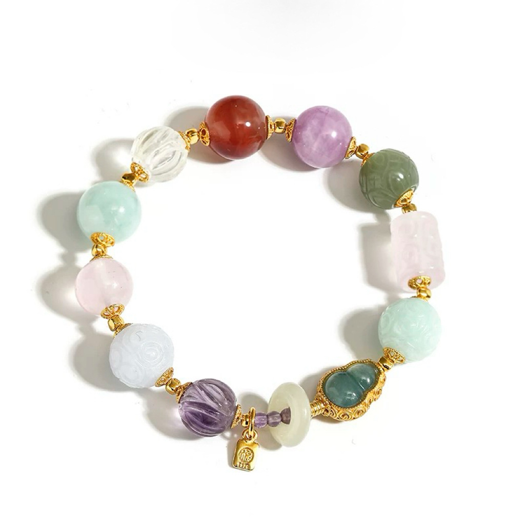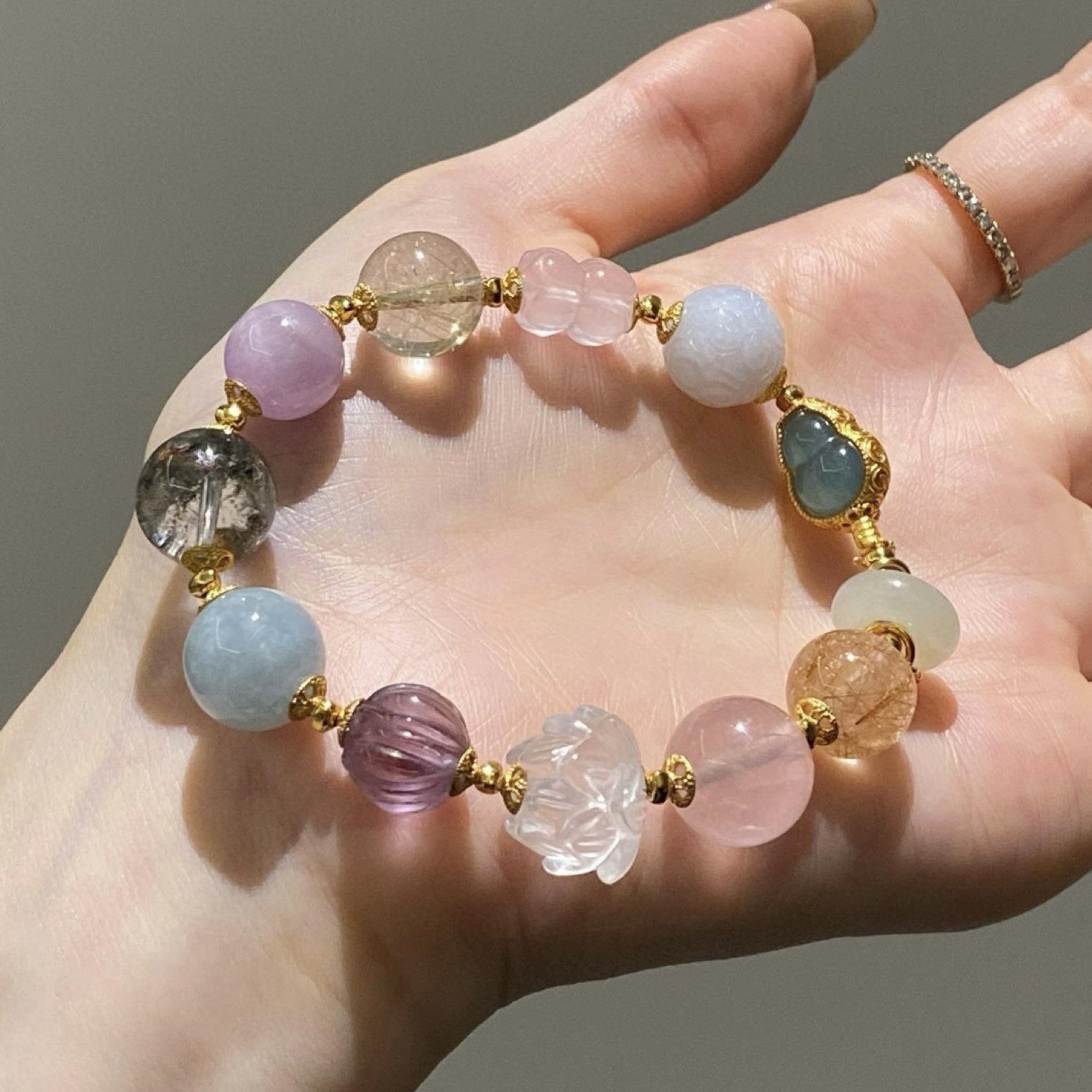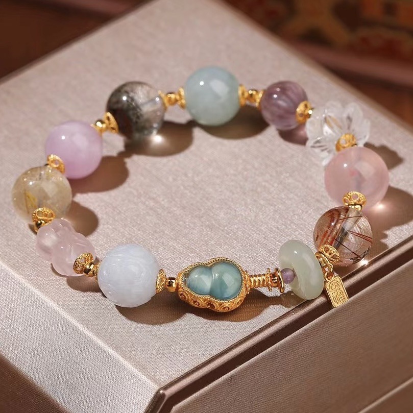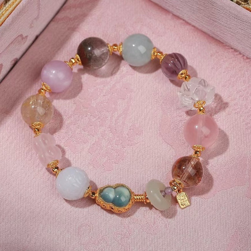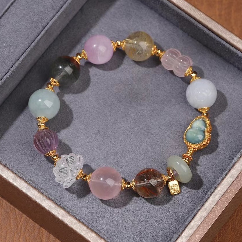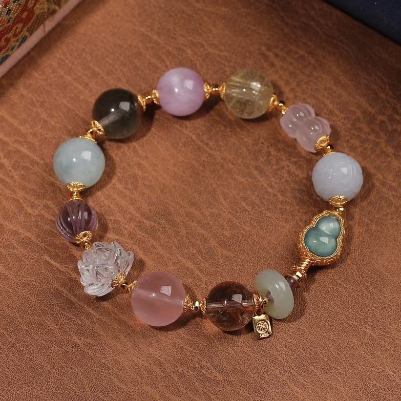 【材质】天然金发晶珠12.4mm左右,天然紫锂辉珠11mm左右,天然绿幽灵水晶12.5mm左右,天然A货翡翠12.5mm左右,天然紫水晶精雕莲花珠11mm左右,天然白水晶精雕莲花珠13.5mm左右,天然粉水晶13mm左右,天然红发晶珠11.7mm左右,和田玉跑环12mm,水晶隔珠3mm左右,925银福牌吊坠,925银镶嵌A货蓝水翡翠葫芦10.9mm,天然A货翡翠紫翡精雕回纹珠12mm,天然粉水晶精雕并蒂莲8.5mm