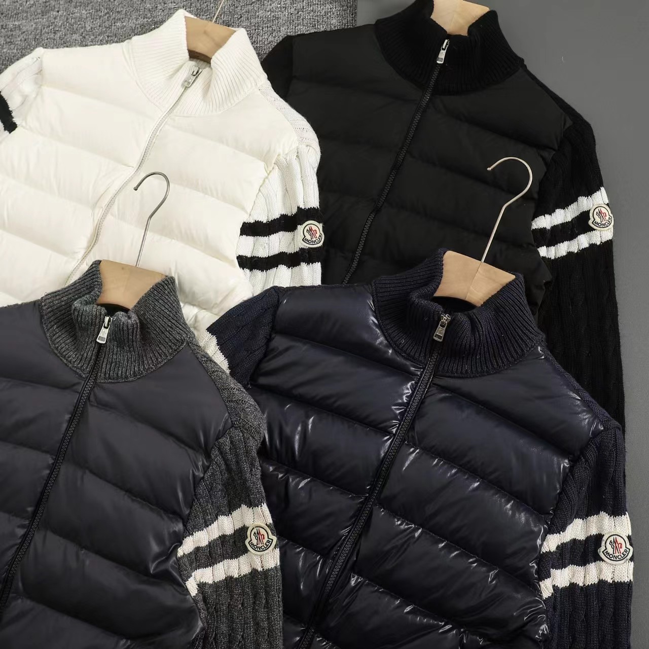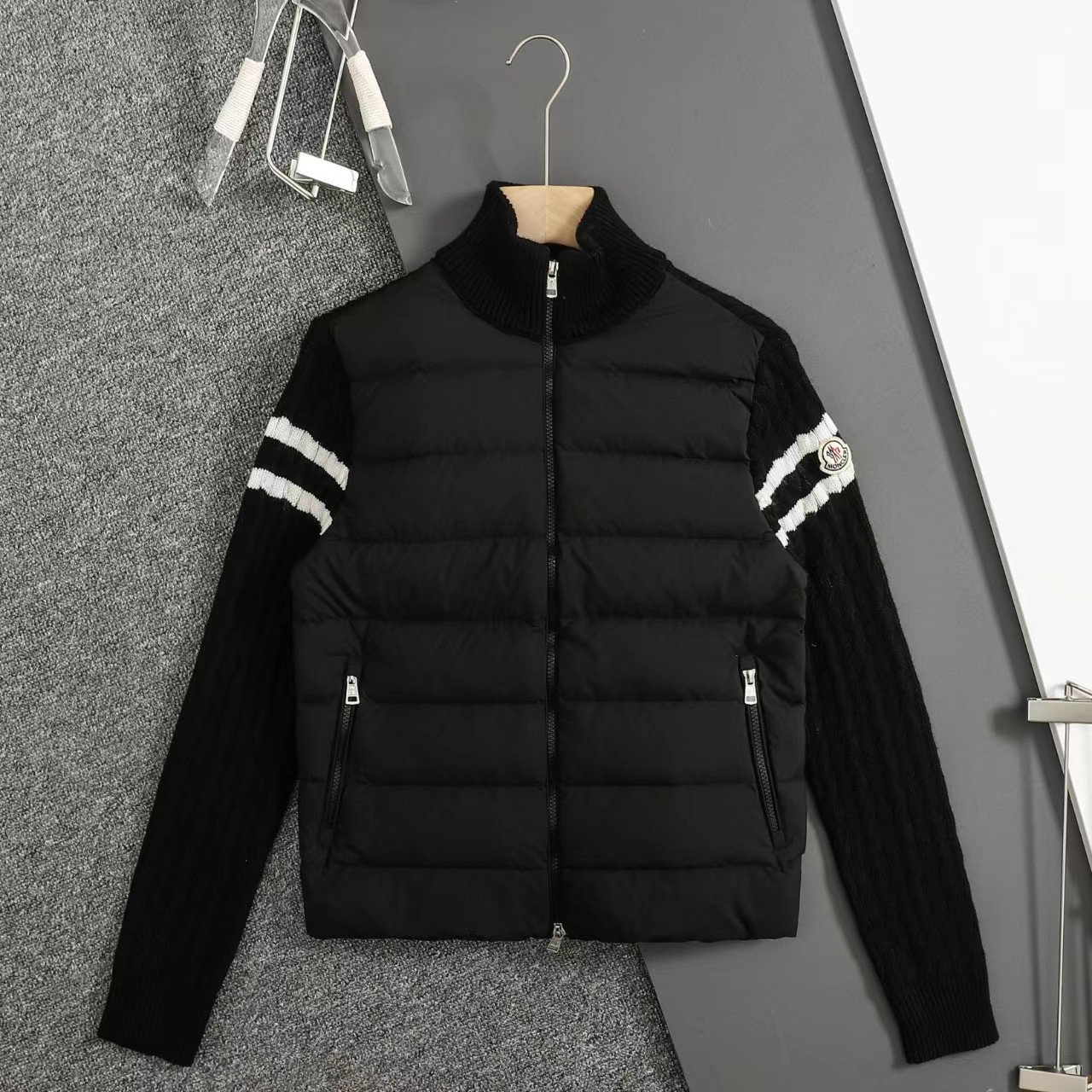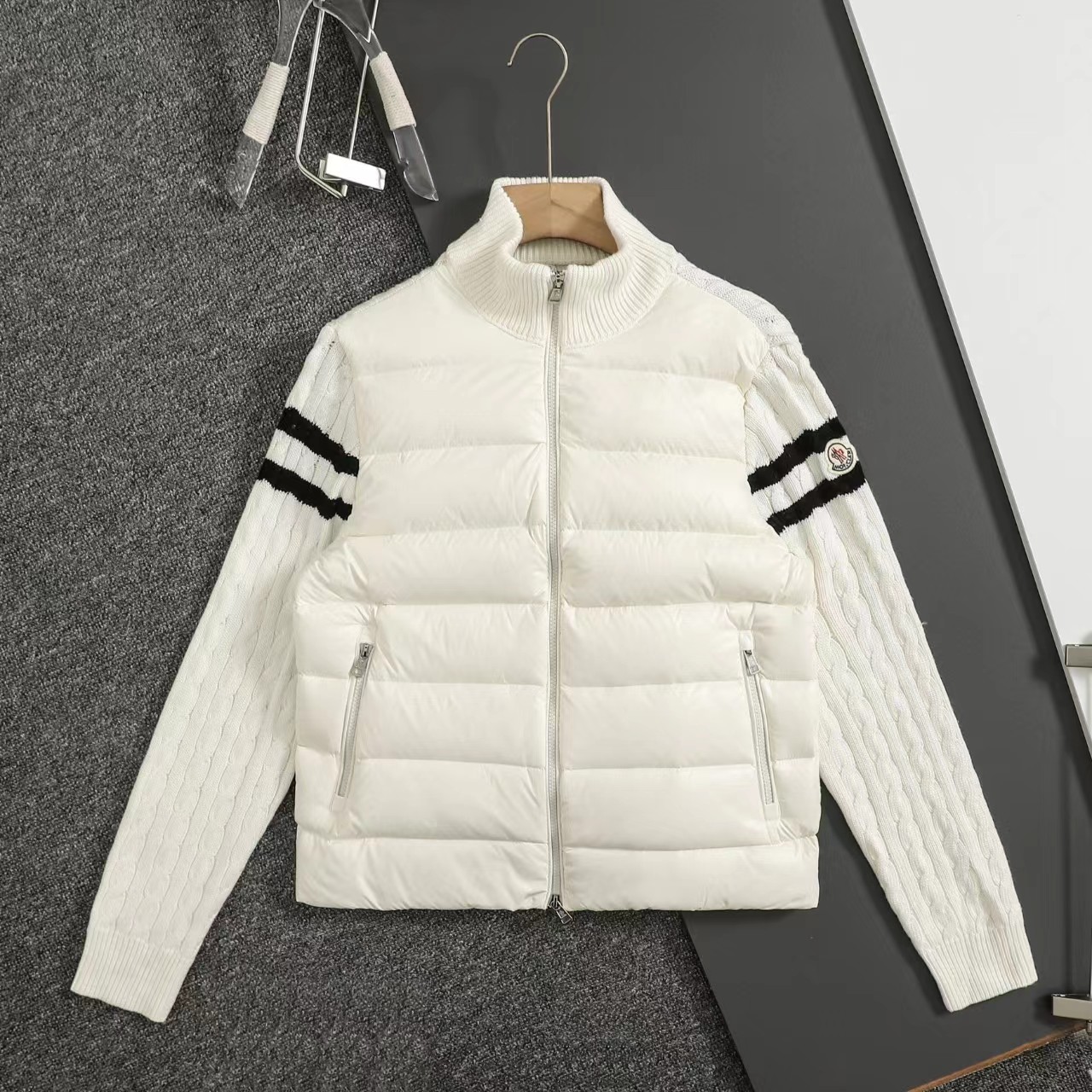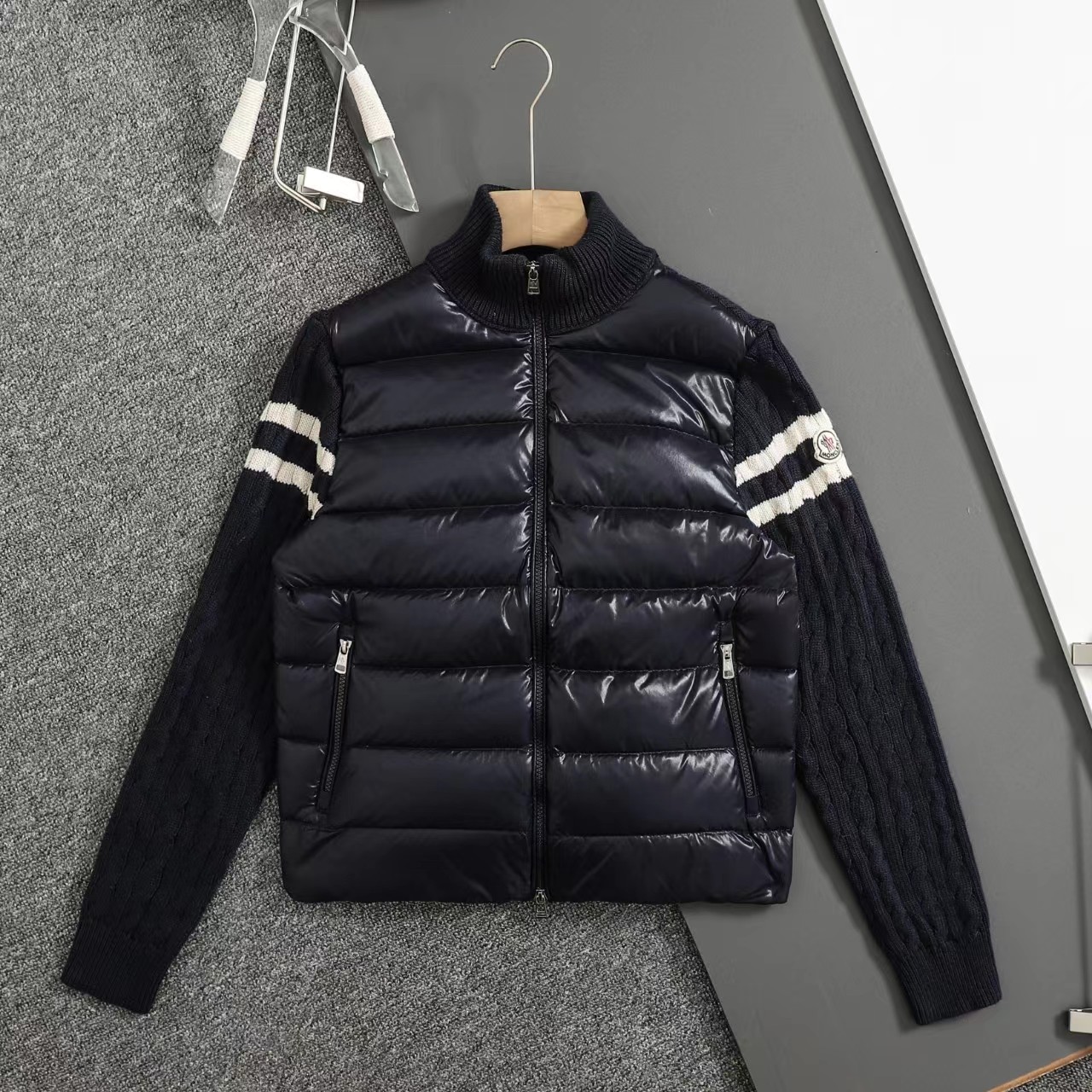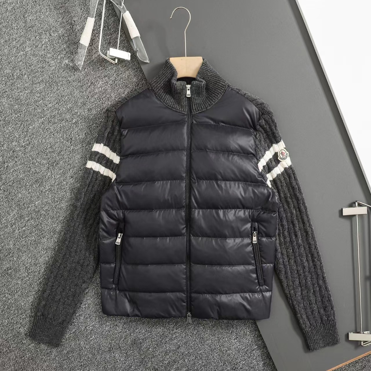 立领针织拼接羽绒服男款羽绒拼接后背 袖子 针织材质 针织拼接 前片 90白鸭绒 整件衣服上身轻便舒适简约 一款气质十分出众的款式,精典的学院风格打造,柔和且优雅的针织袖拼接设计,更显那种奢华复古的独特风情味道