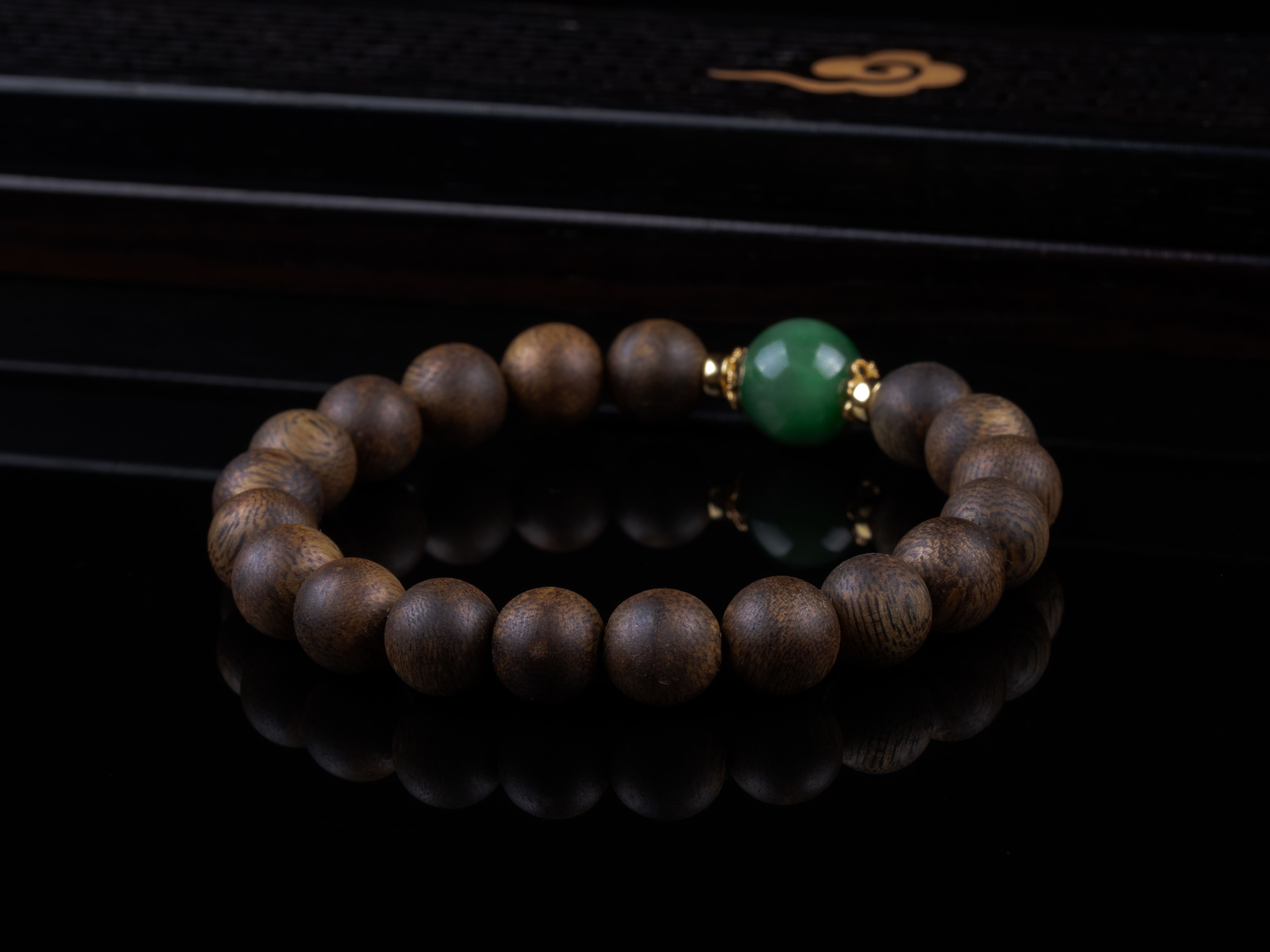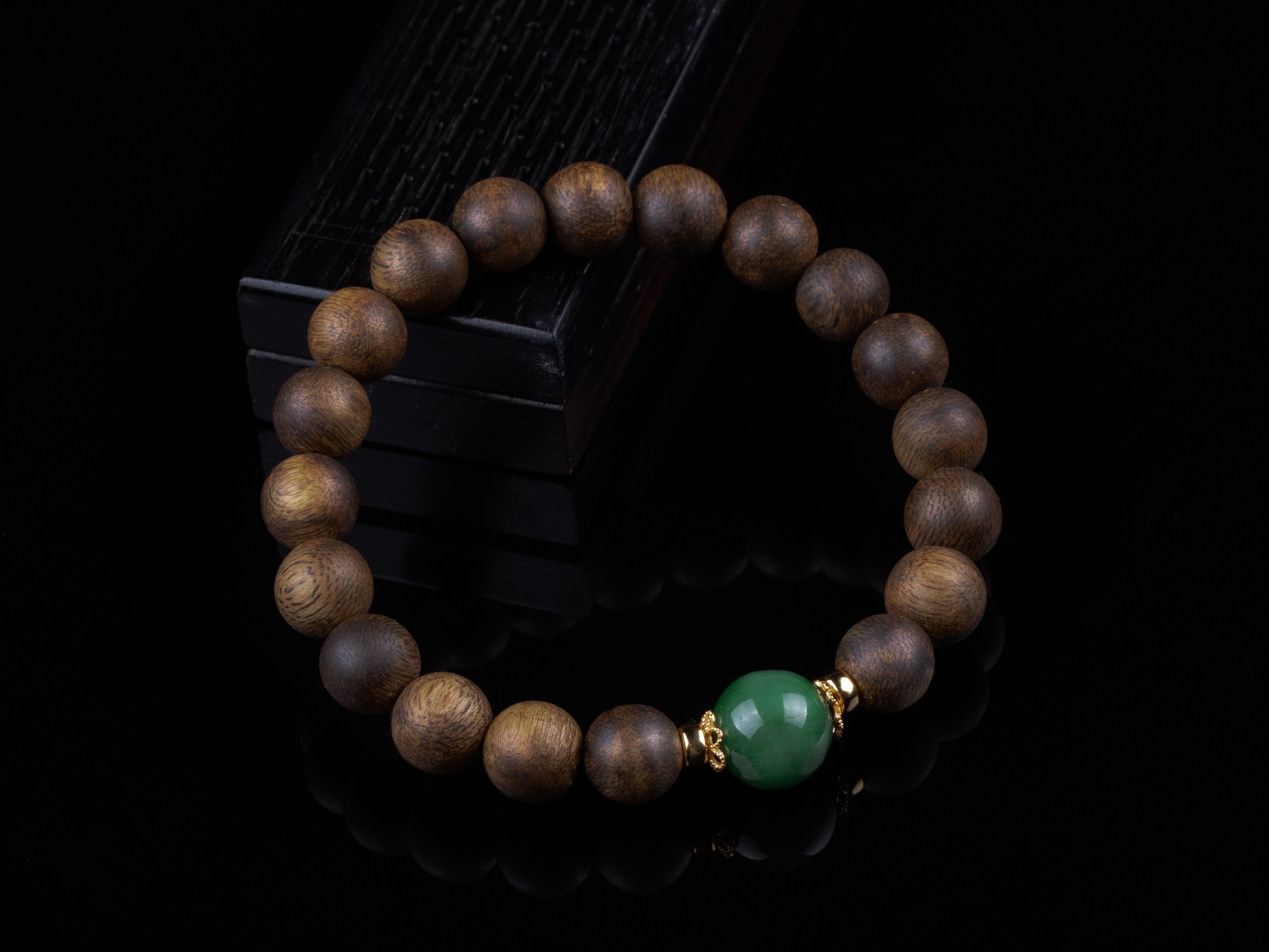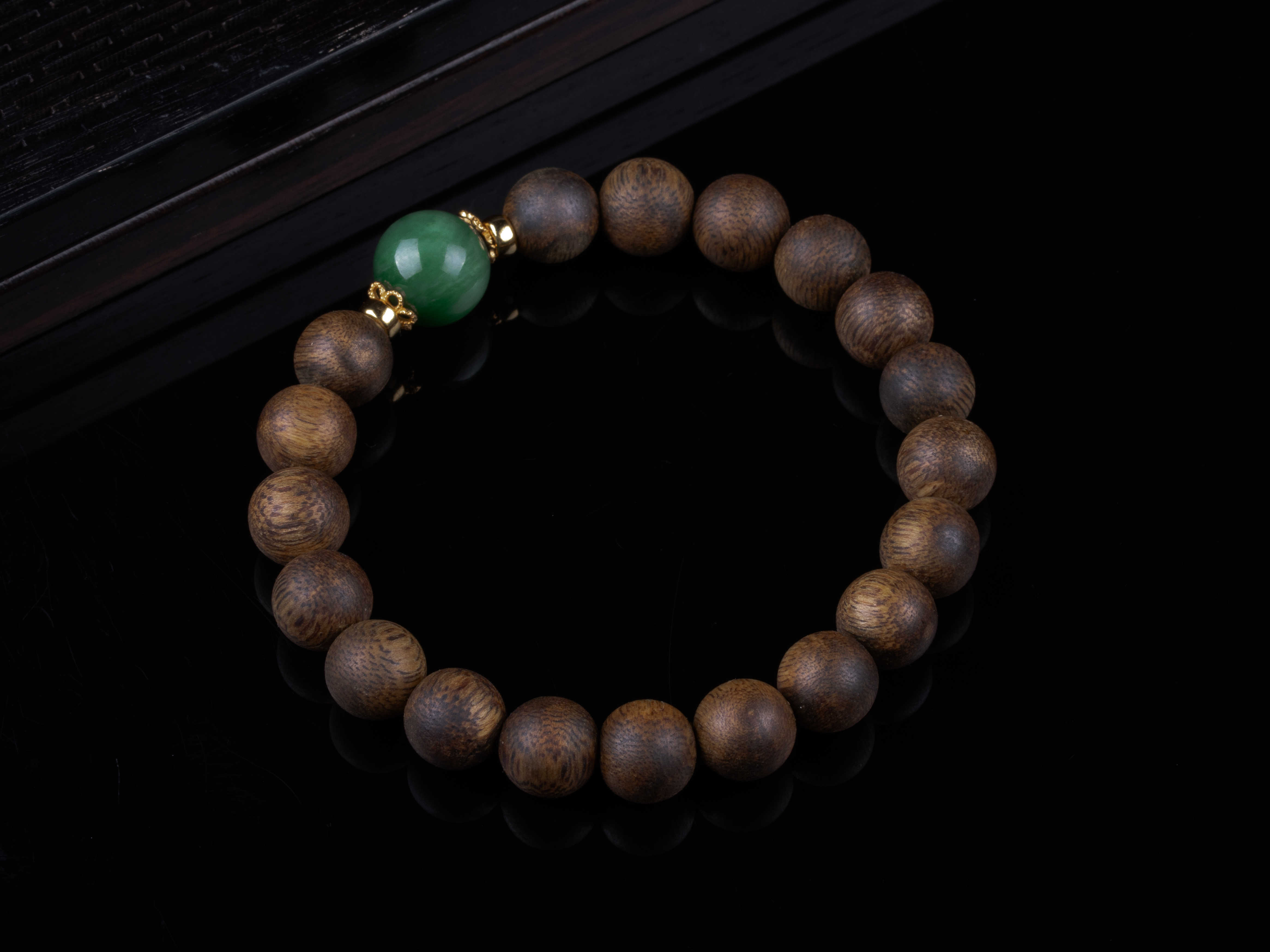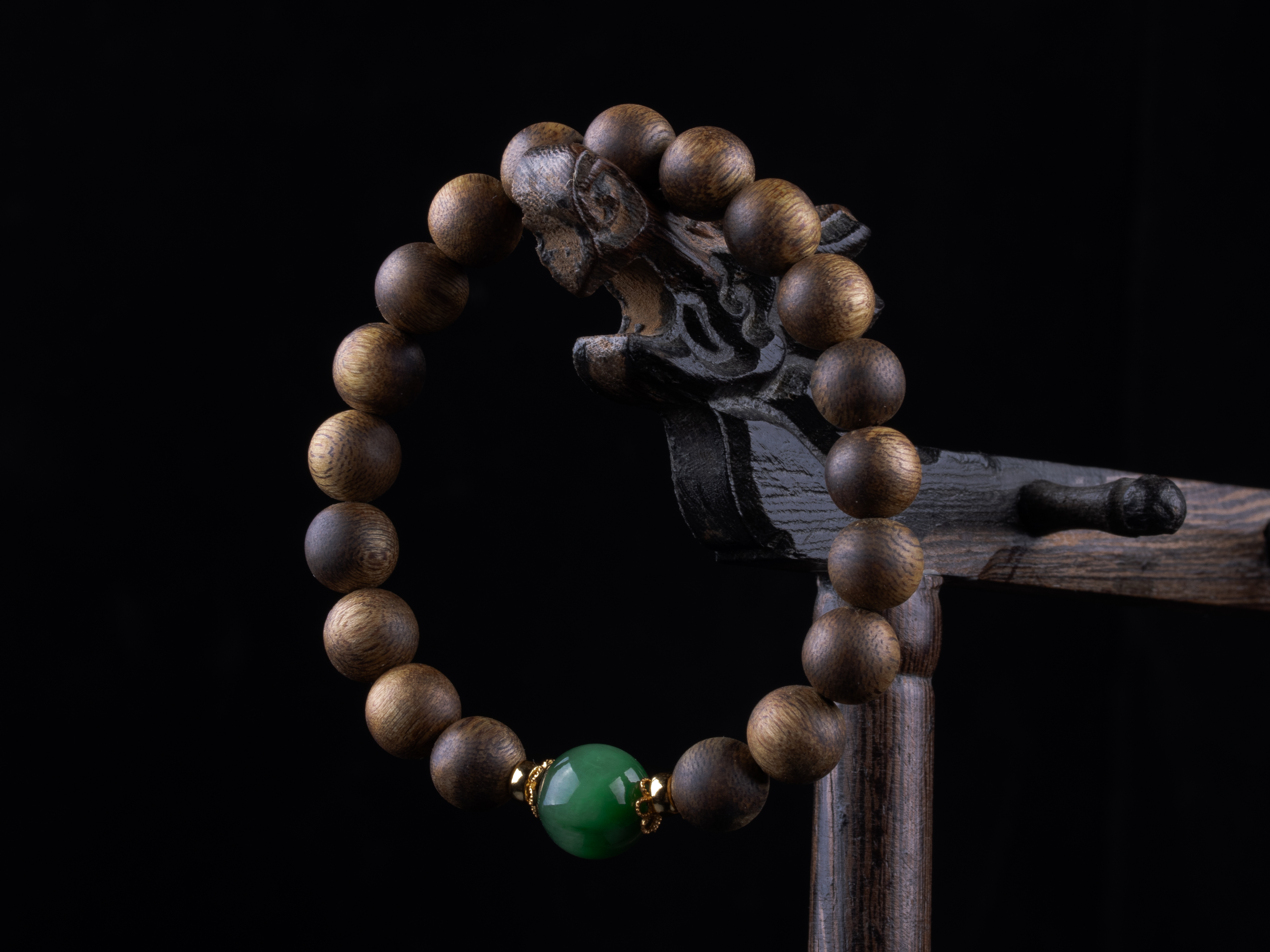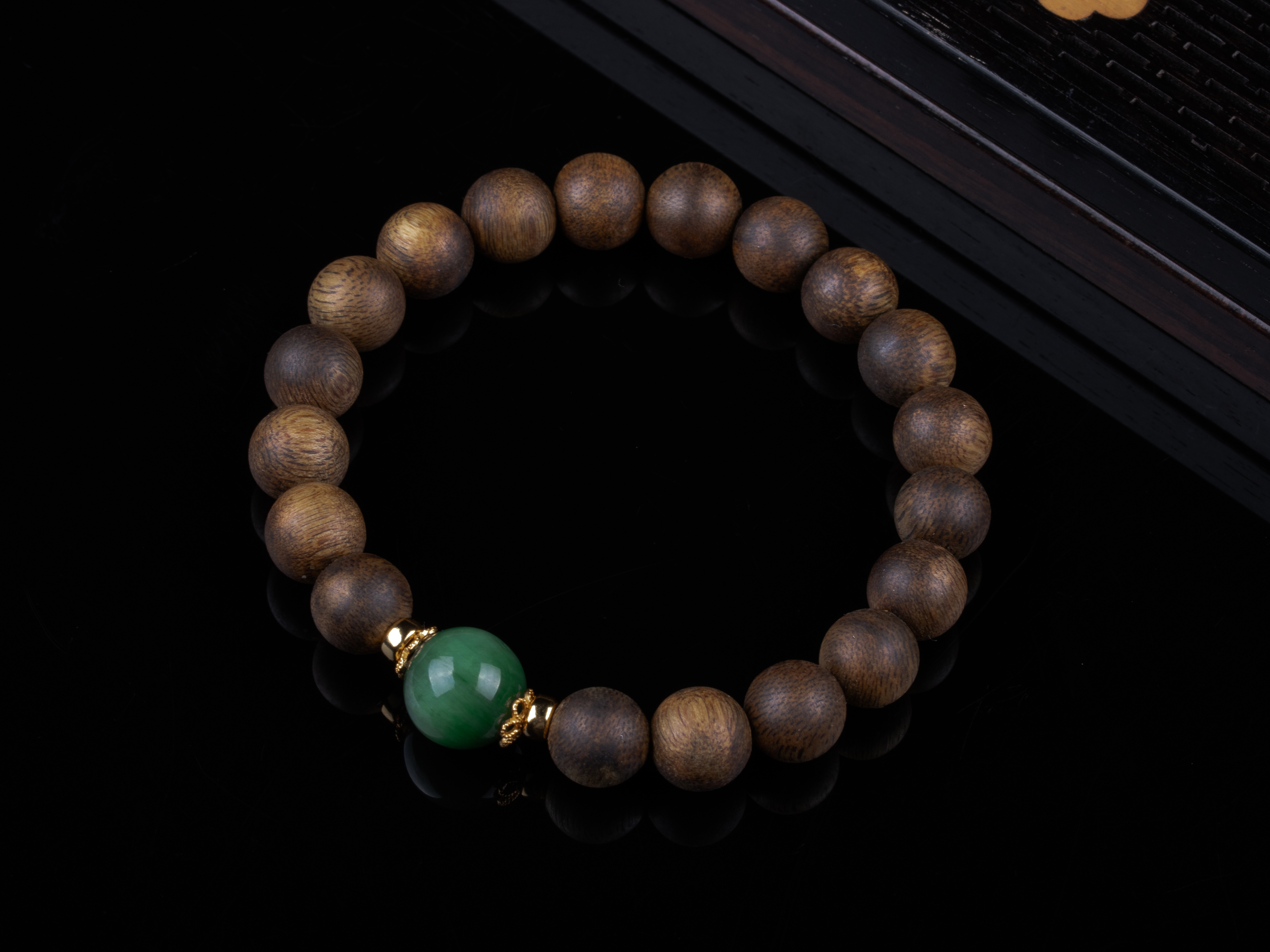 XY0279沉香+碧猫眼手串.银,天然沉香约9.3mm,原色原味,香味自然清甜,925银花托起一颗猫眼碧玉,整体古色古香,韵味十足。