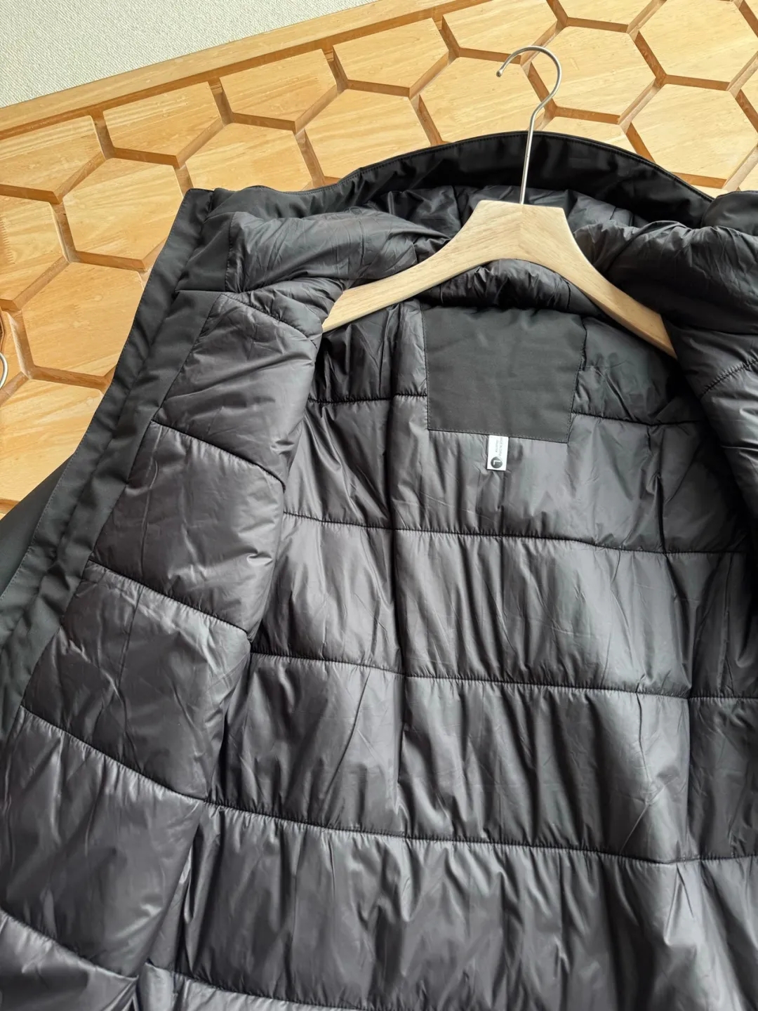 括号手插兜剪裁设计 ,特定加厚加密梭织防水层面料,,防风防水,内里面料20d尼龙 不静电 填充采用一片式轻量棉,有厚度的多层纤维结构 工艺,均匀 机洗不坨绒,蓬松轻便和羽绒服一样,蓄热保暖