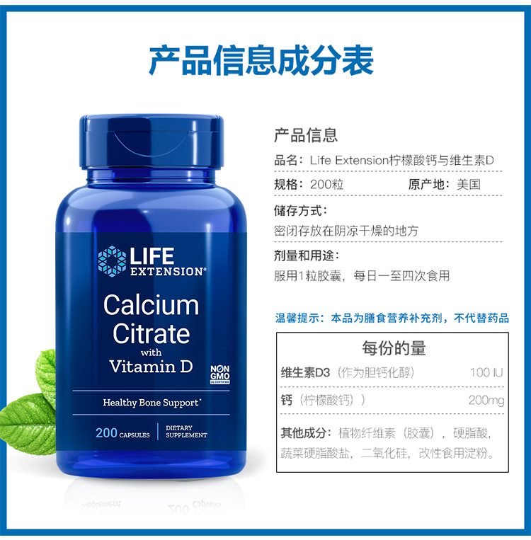 沿寿LIFE EXTENSION柠檬酸钙与维生素D 200粒