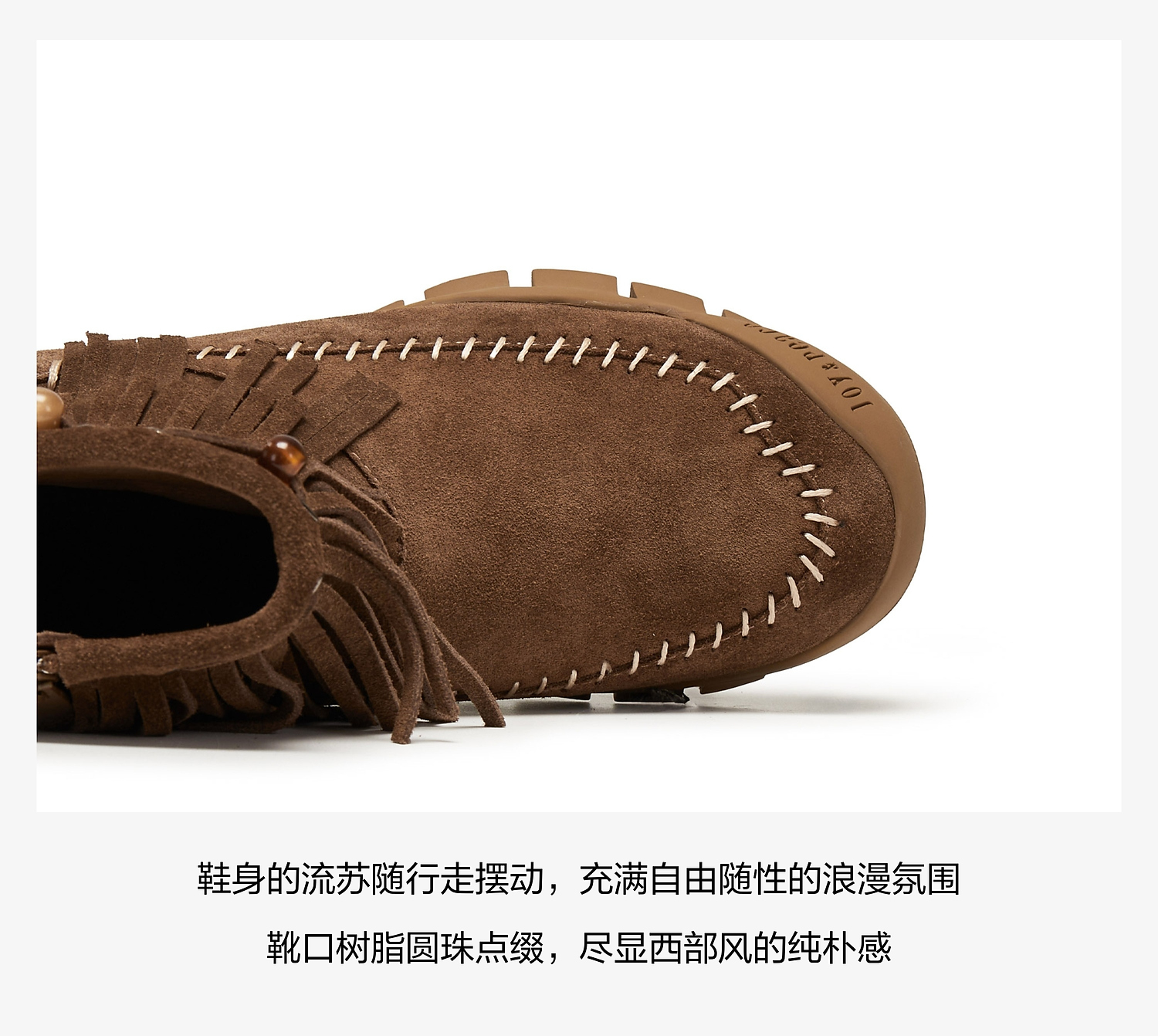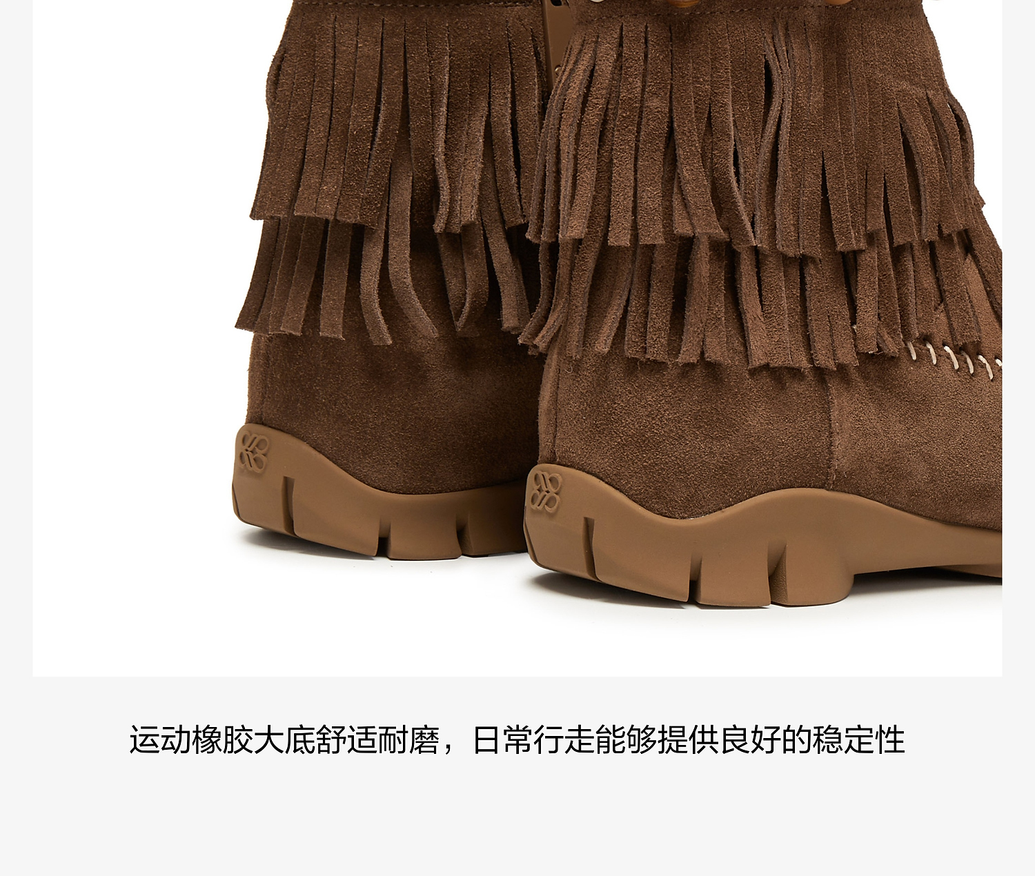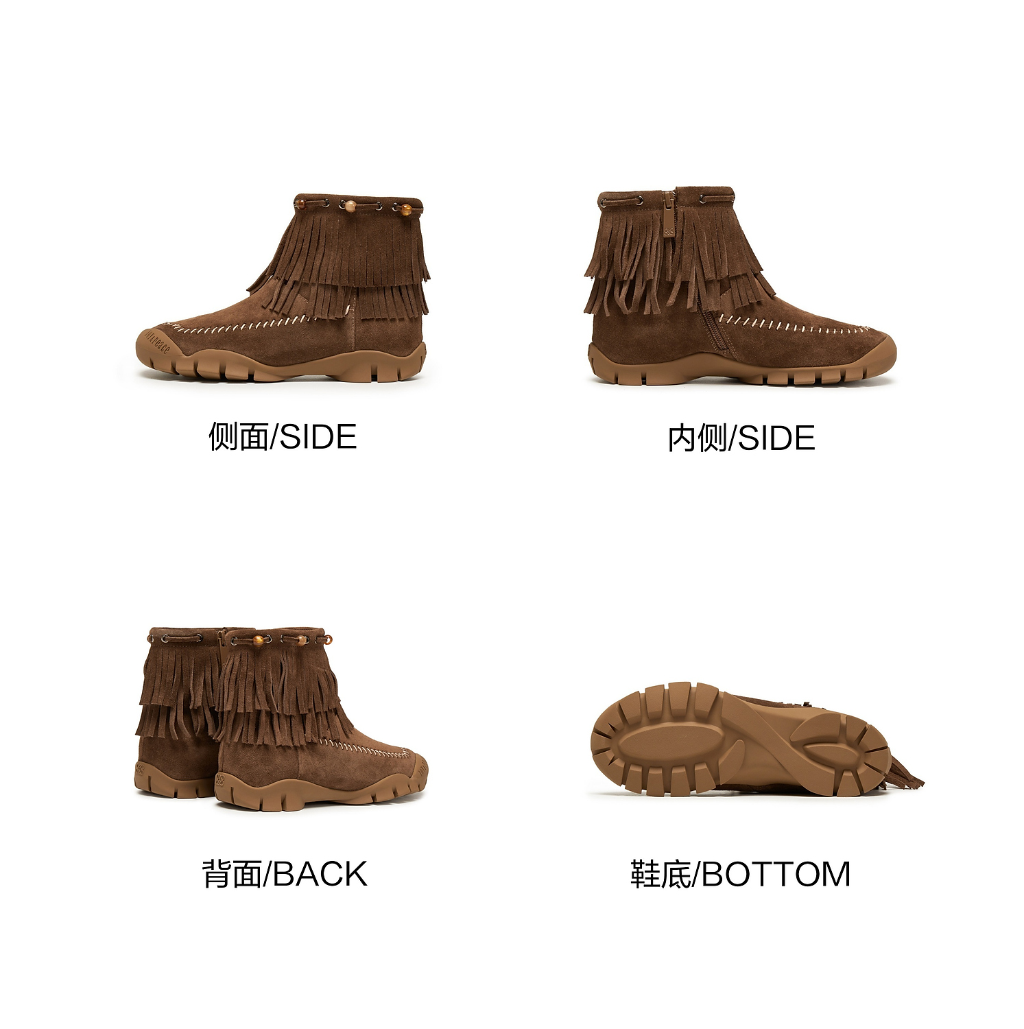 BF楼真美诗2025新冬牛皮流苏复古运动短靴棕色西部牛仔靴女06715DD5吊牌价1998折后价1598