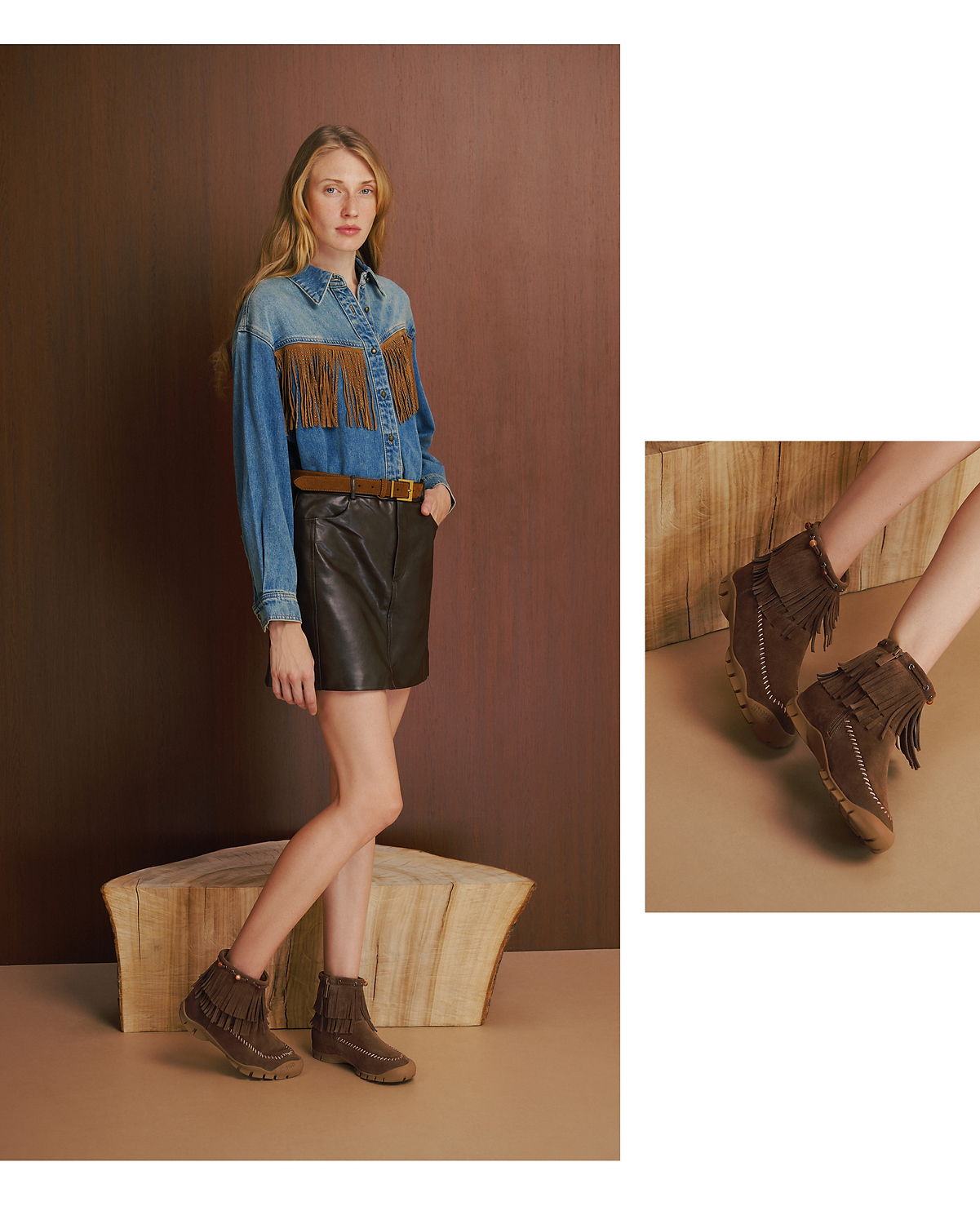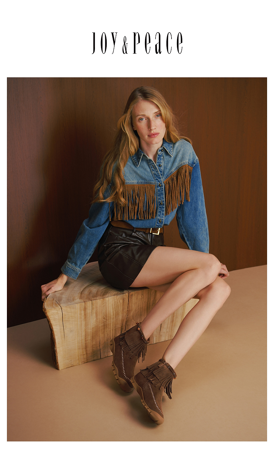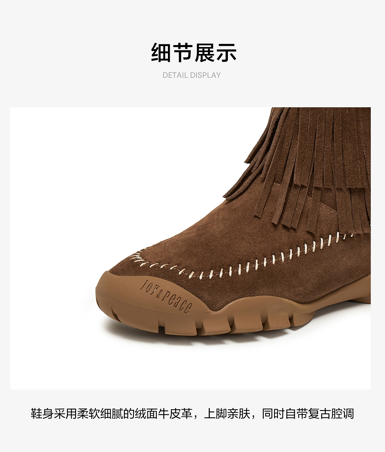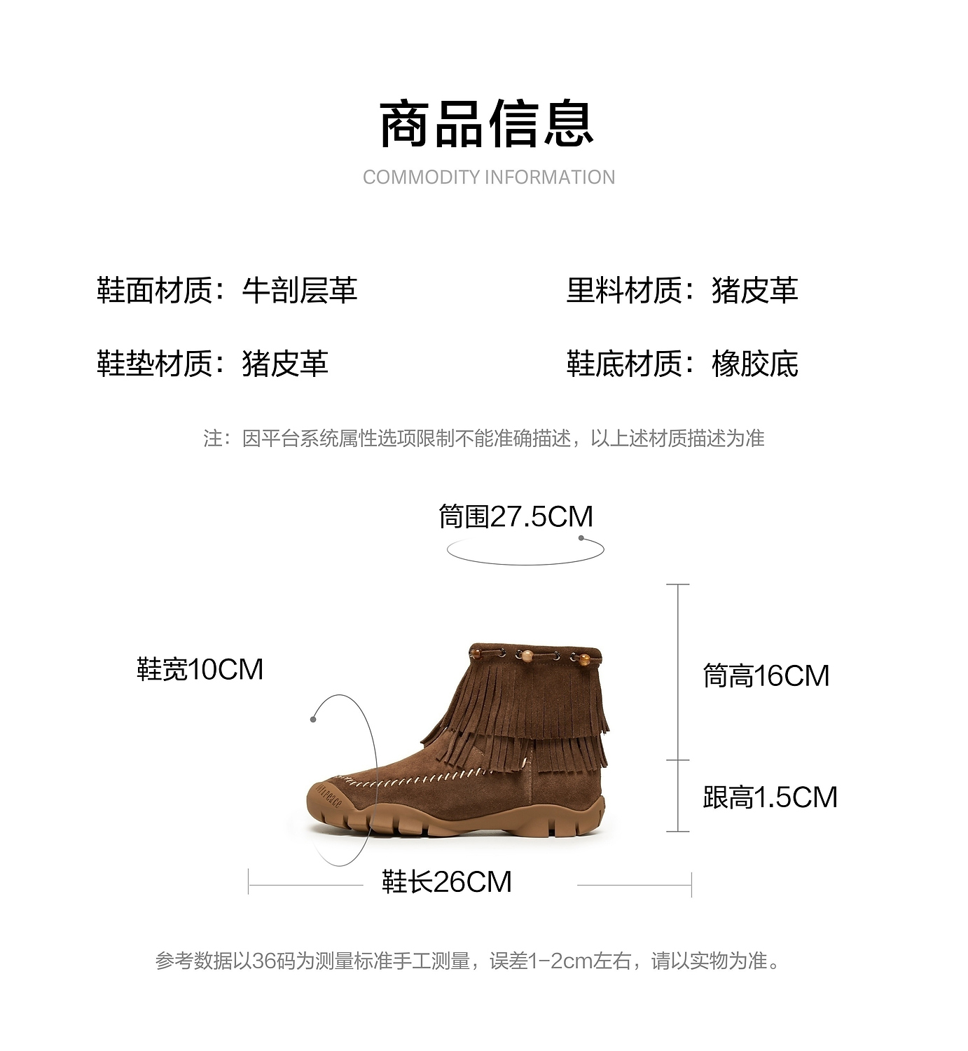 BF楼真美诗2025新冬牛皮流苏复古运动短靴棕色西部牛仔靴女06715DD5吊牌价1998折后价1598