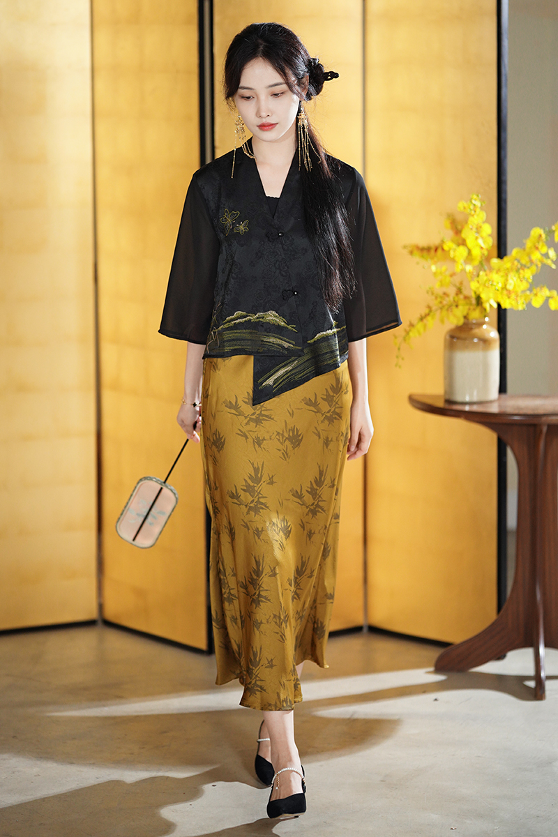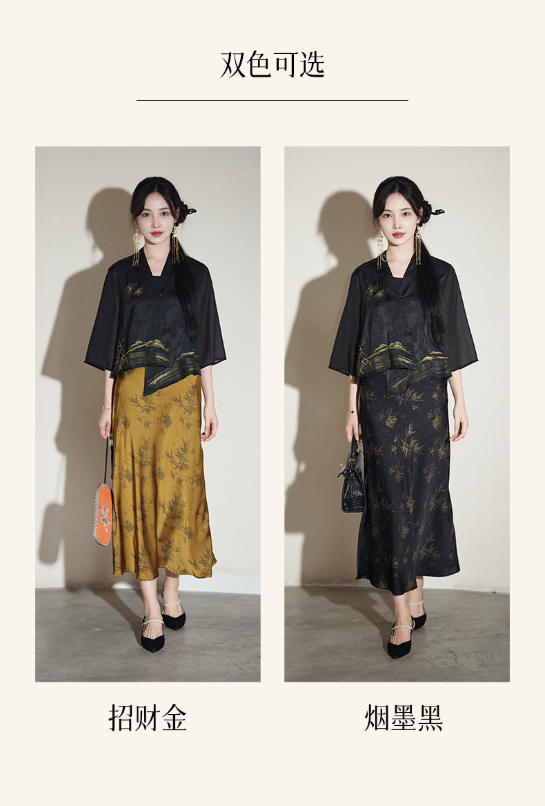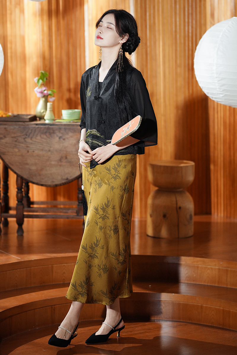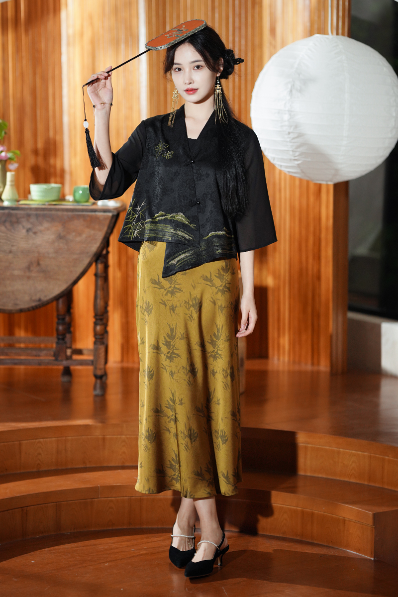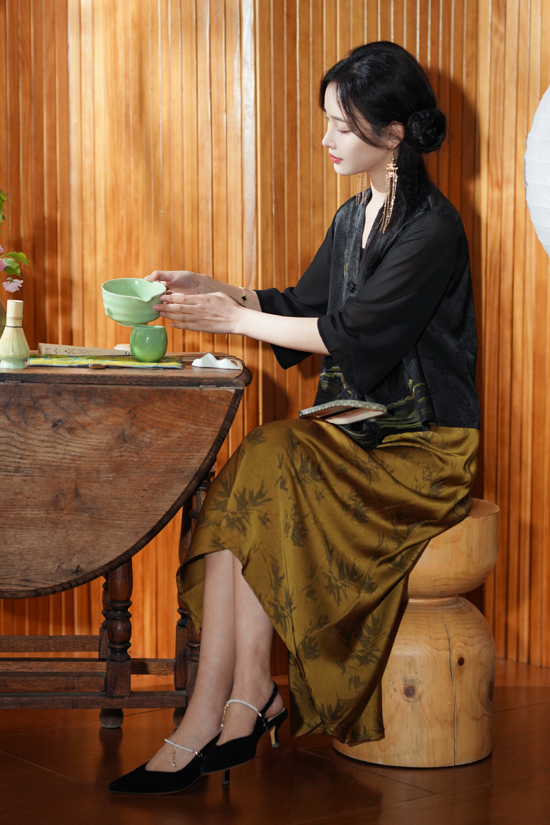上衣可以搭配我们所有的新中式衣服,绝美啊~~!!整一个清冷感十足的江南大美女🌺 平时参加聚会需要抬气场呀,去书院读书喝茶需要展现出书卷气息呀都适合穿。想象一个手指笔墨的盘发女子,穿着一条竹子纹样的长裙,在认真的写书法,也太有文人墨客的江湖气息了。