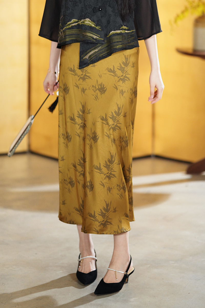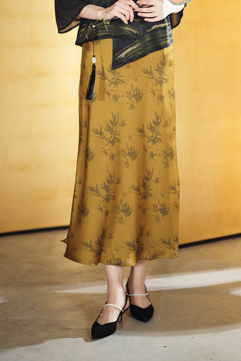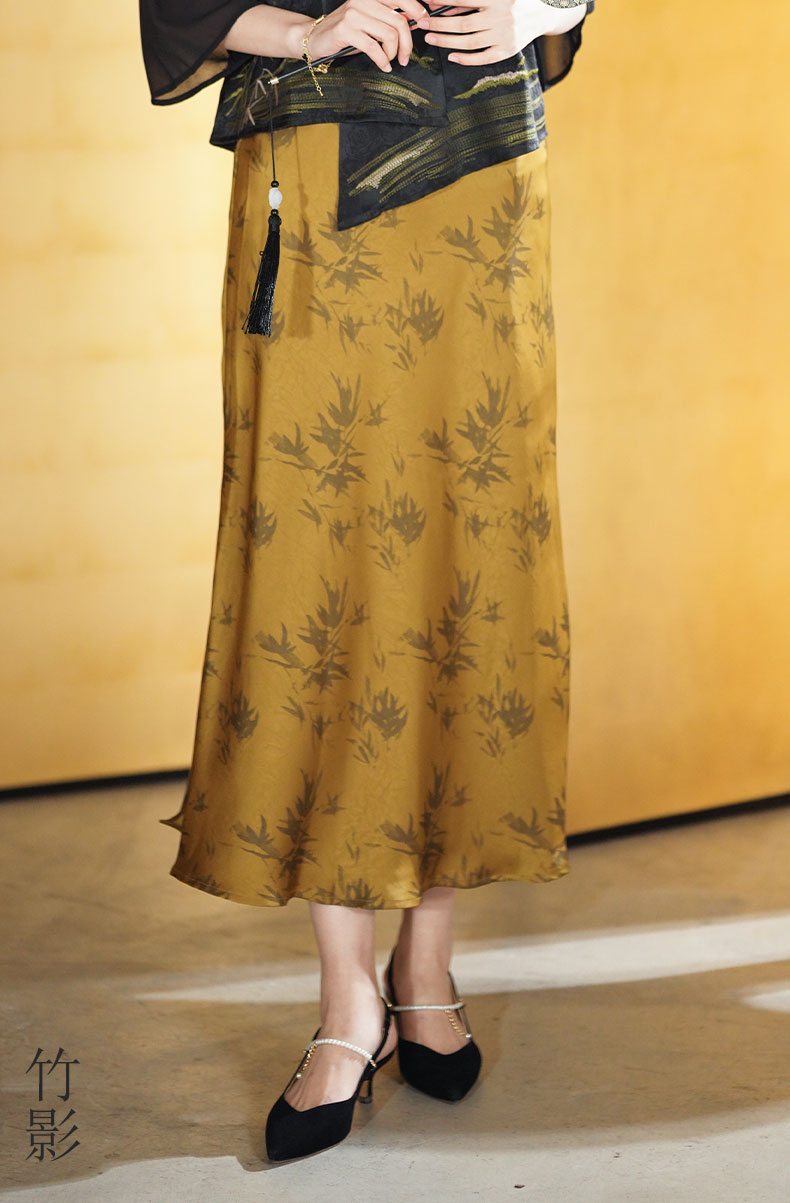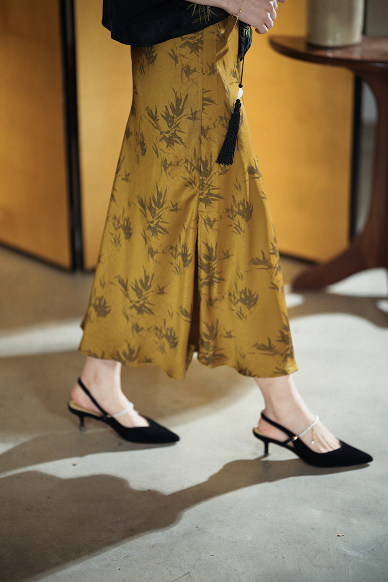 裙子选用暗色底调,搭配水墨画般的竹叶图案,细看竹叶图案还闪烁着微微的珠光调,高贵又不失内敛。仿佛把水墨画卷穿在身上,颜色与竹子花型淡雅清新,自带中式韵味,在夏天众多的碎花裙中独具一格。
