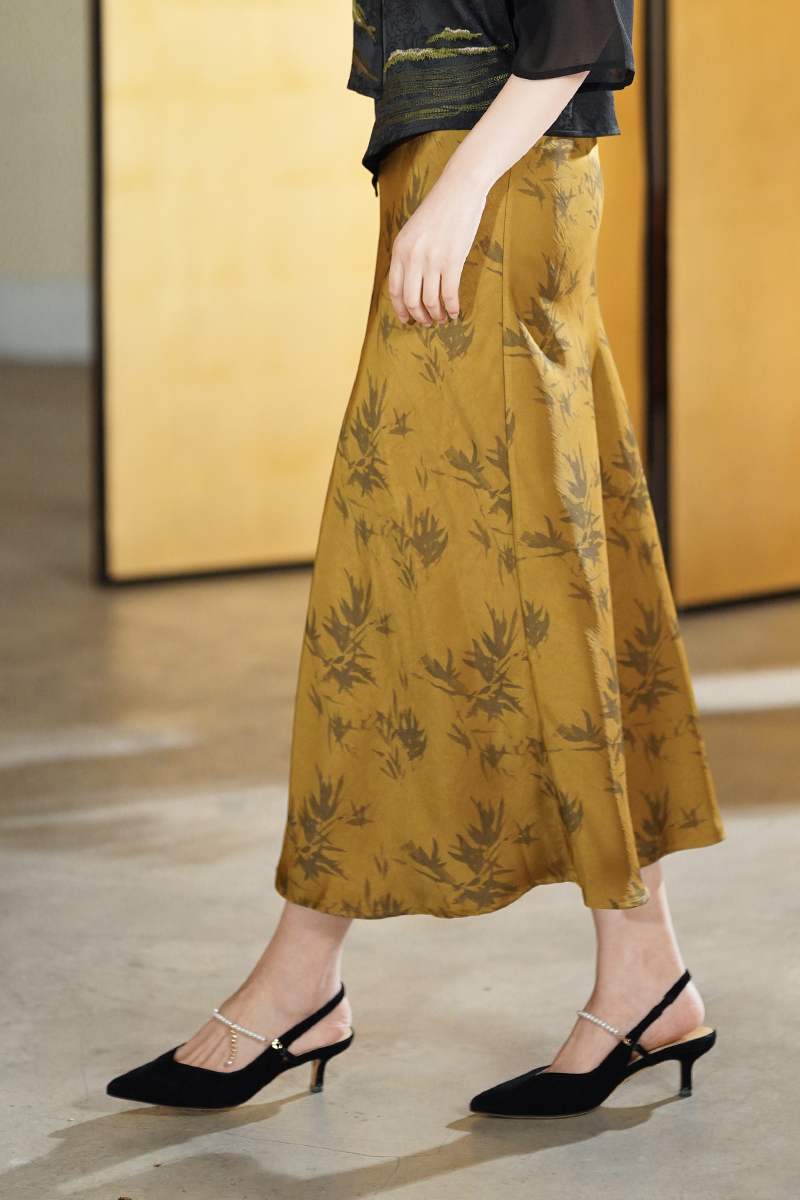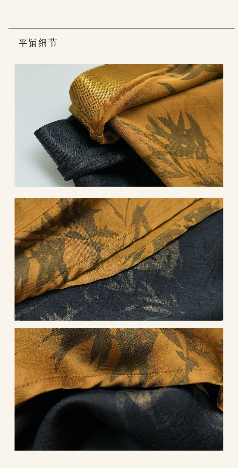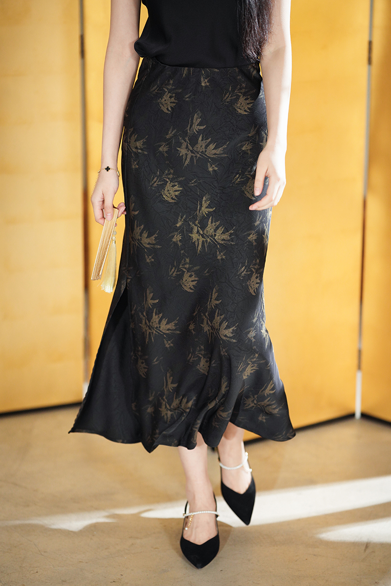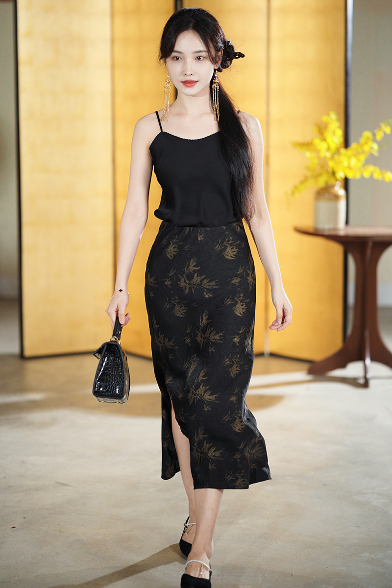 神秘经典的秀场流行色,这个色的竹子印花珠光感稍强一些,将竹的清丽气质淋漓展现,打破黑色来带的沉闷感,总体不会过于张扬又足够吸人眼球;融合竹子的雅致脱俗之感,用黑金碰撞出东方大气之美。