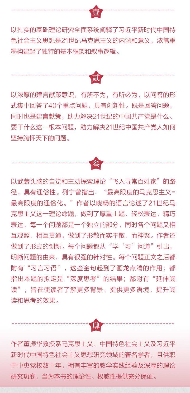 ★以武装头脑的自觉和主动探索理论;飞入寻常百姓家的路径,具有通俗性。列宁曾指出:;限度的马克思主义=限度的通俗化。作者以晓畅的语言论述了 21世纪马克思主义这一理论命题,做到了厚重主题、轻松表达、精巧表达,每一个问题都是一个独立的部分,同时各个问题又相互观照、相互贯通,做到了形散而实不散、而神聚。作者还做到了形式的创新。每个问题都从;学lsquo;习rsquo;问道引出,明晰问题的由来,具有很强的针对性。每个问题正文之后都附有;习言习语,这些金句起到了画龙点睛的作用;都指出本题的拟定是;深度思考的结果;都附有;延伸阅读,旨在使读者了解更多背景、提供更多语境,提升阅读和思考的效果。