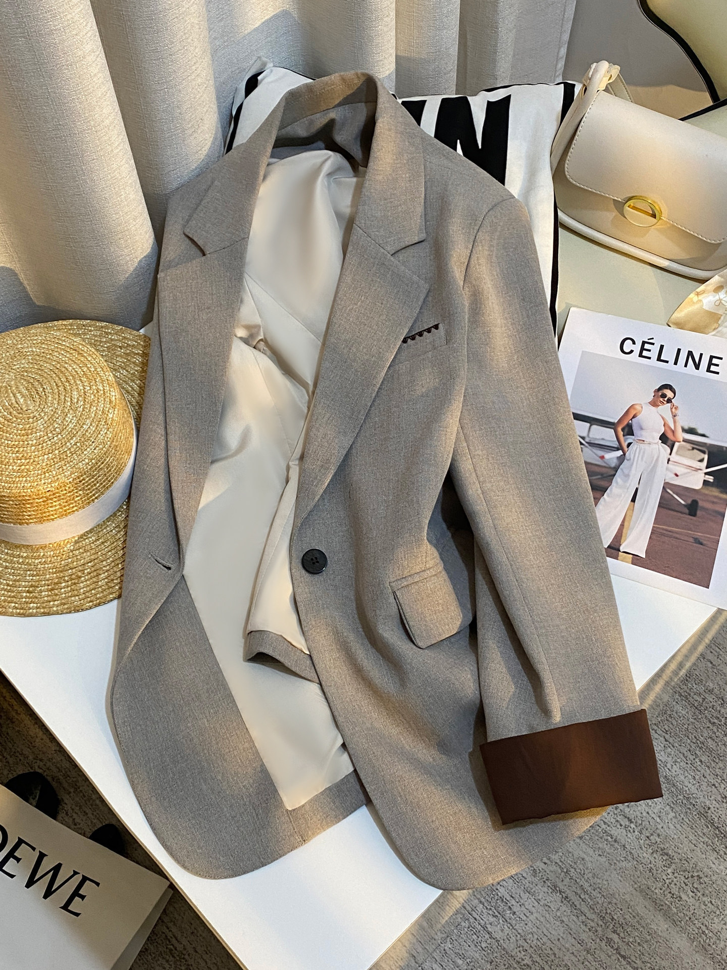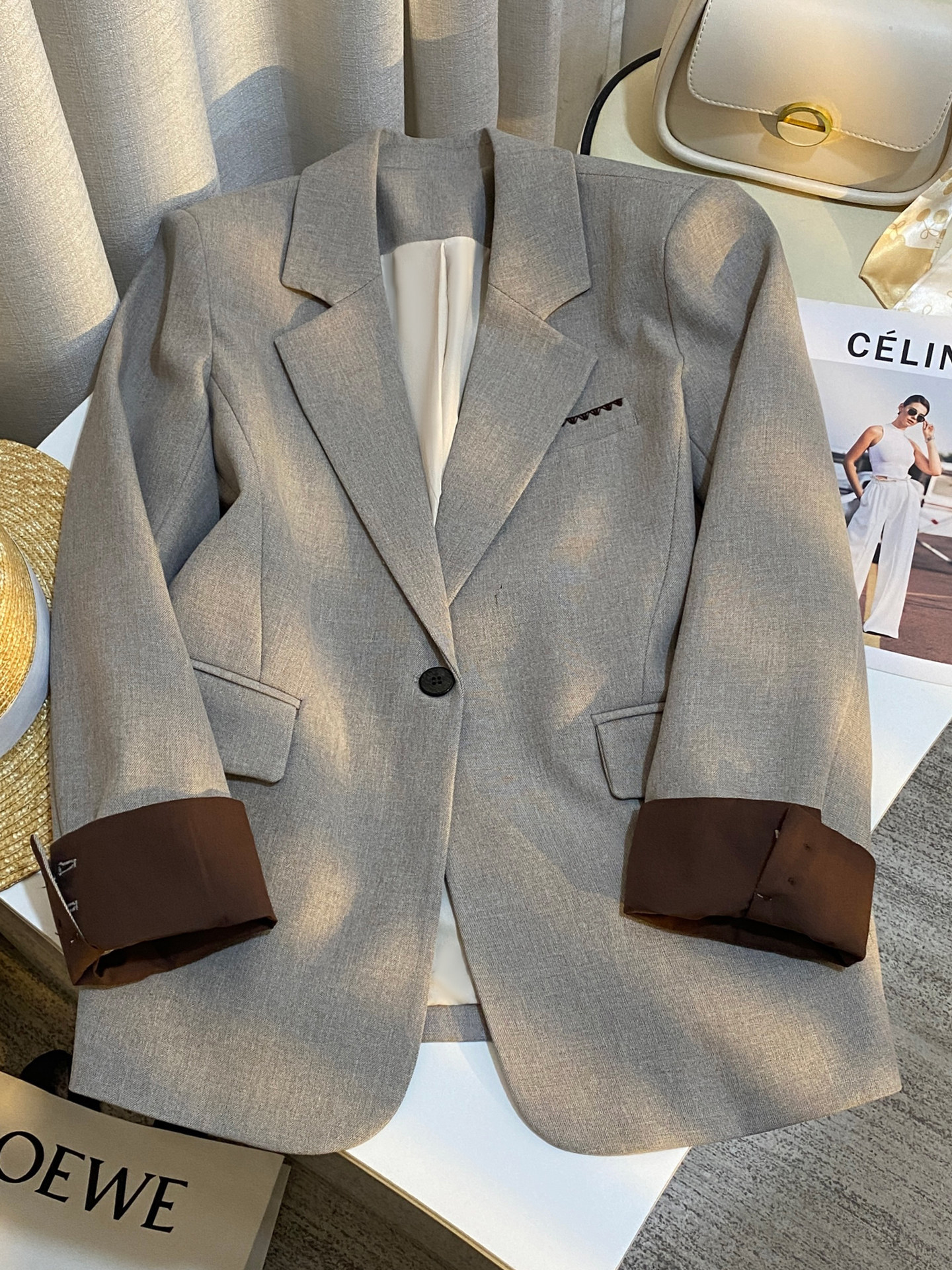 【清风外衣】米灰色复古高级感!2026轻奢撞色设计西装外套女2026新款小个子西服!