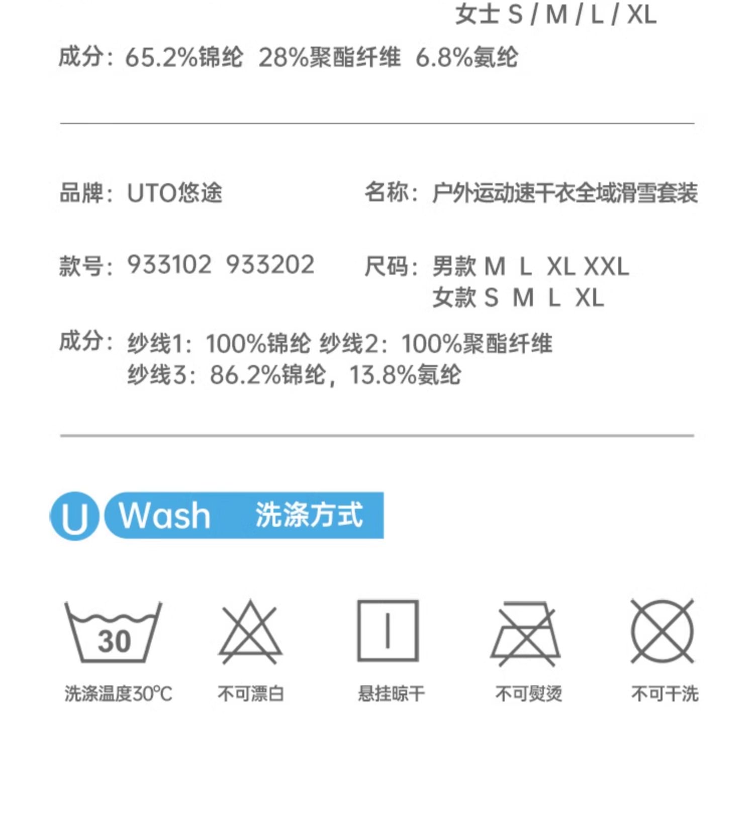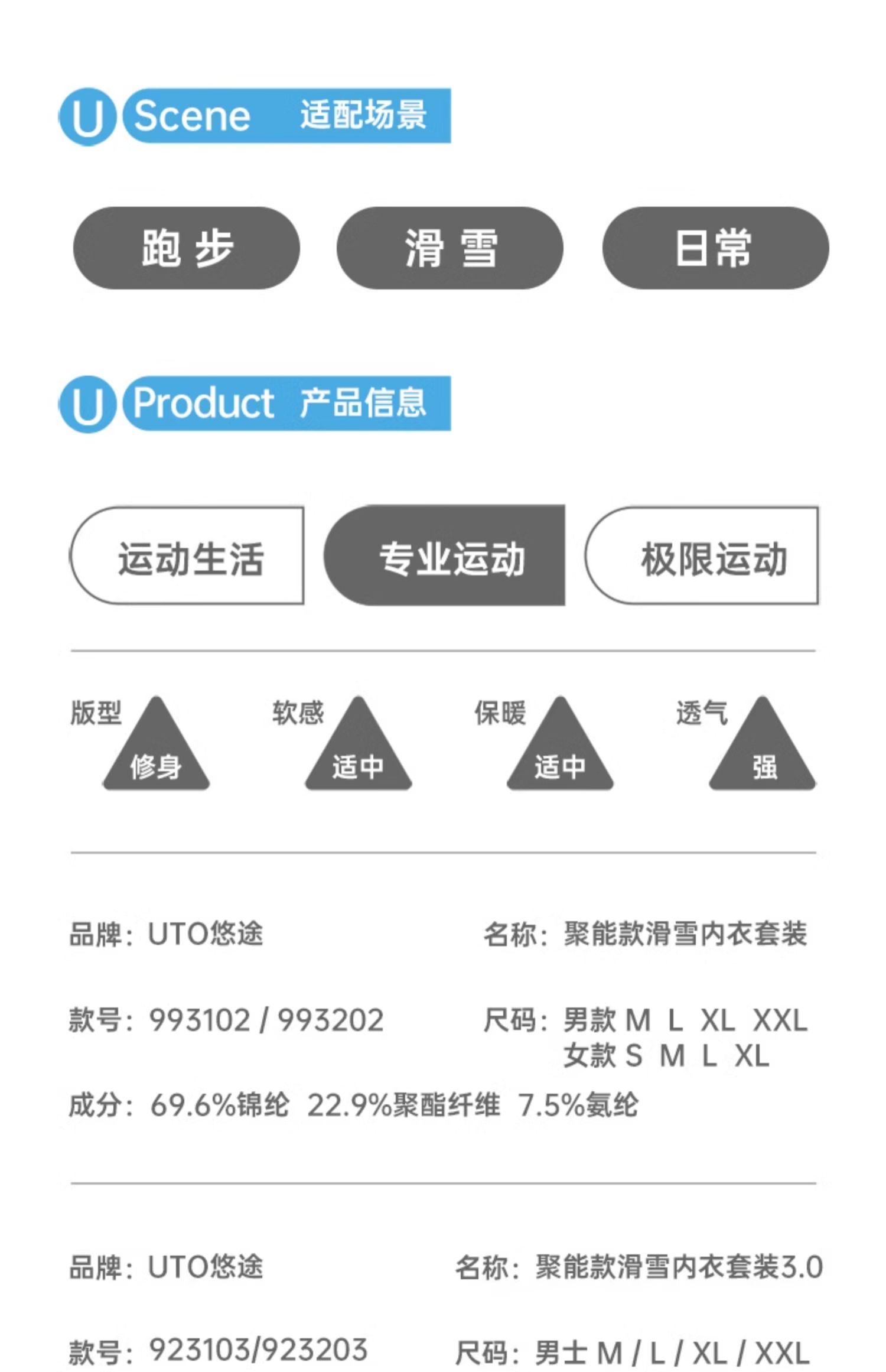 UTO悠途全域滑雪速干衣男运动排汗内衣压缩衣女户外保暖内衣套装923203