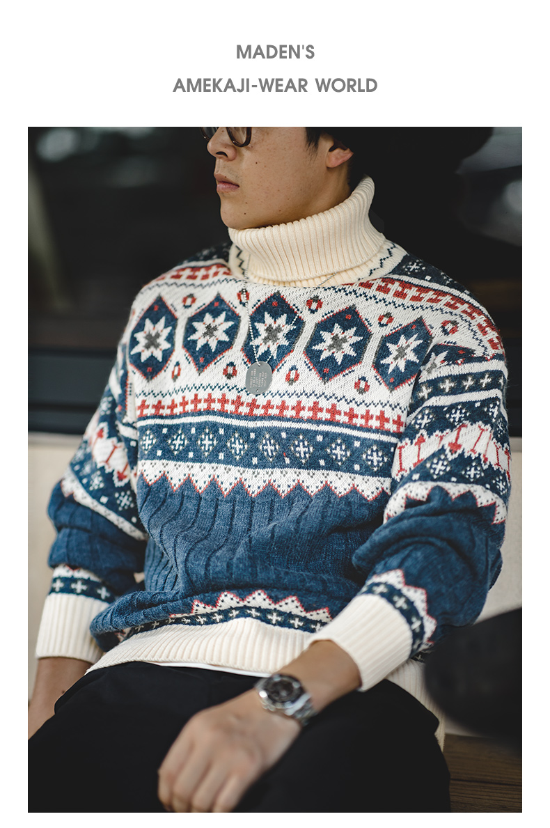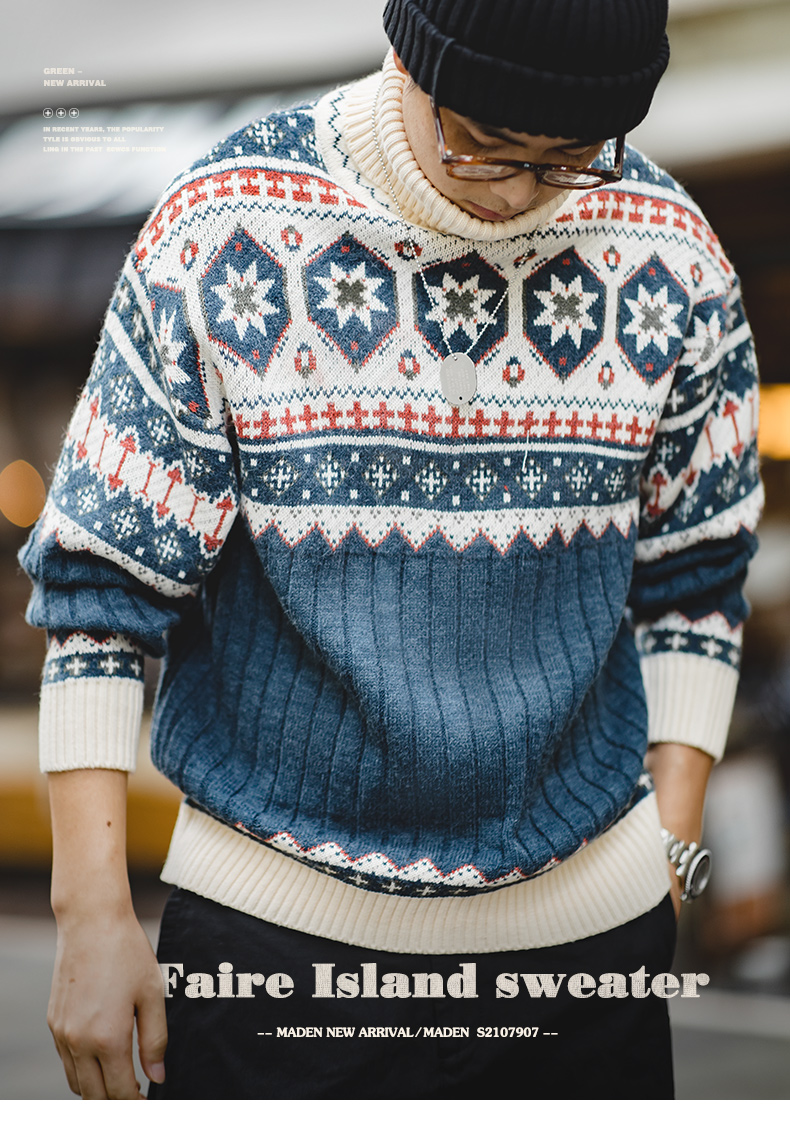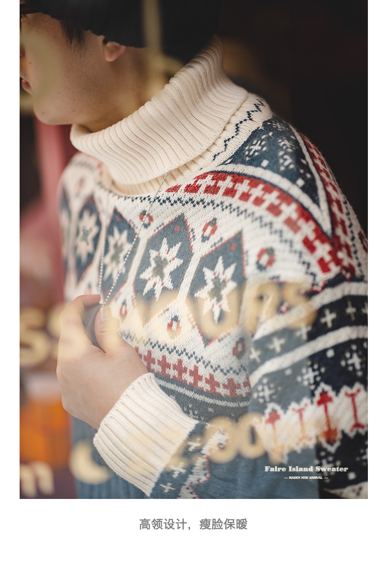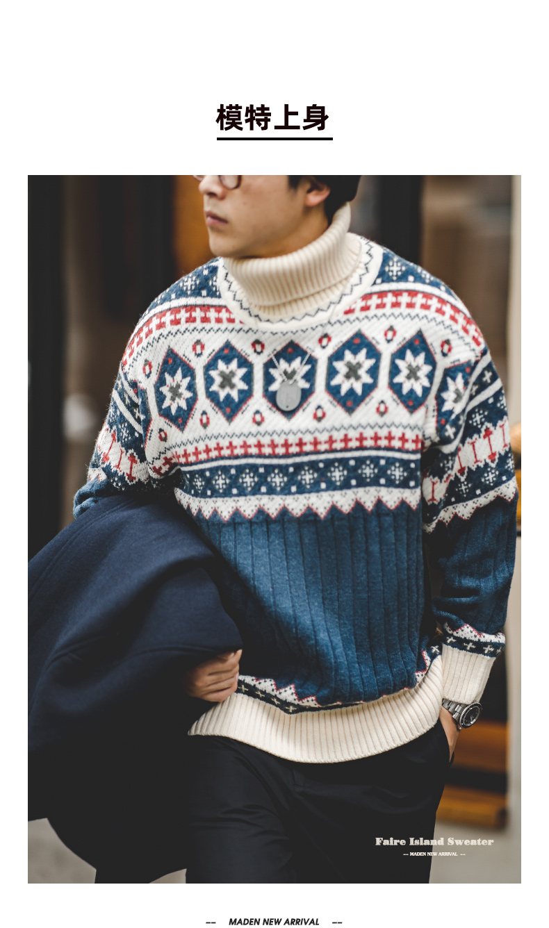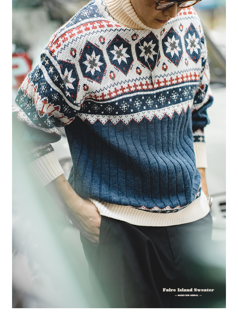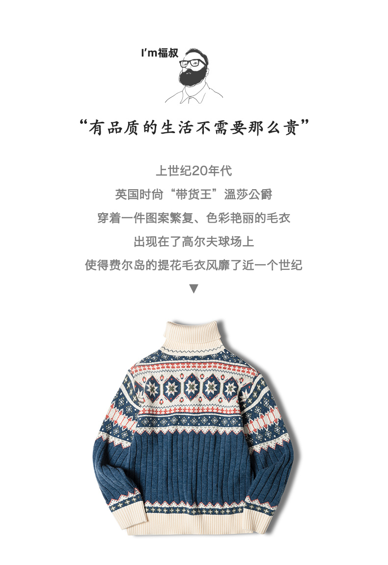 工装优选 日系复古费尔岛提花毛衣厚实保暖可翻高领针织衫男秋冬