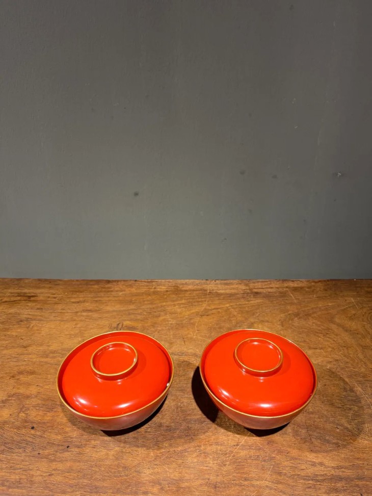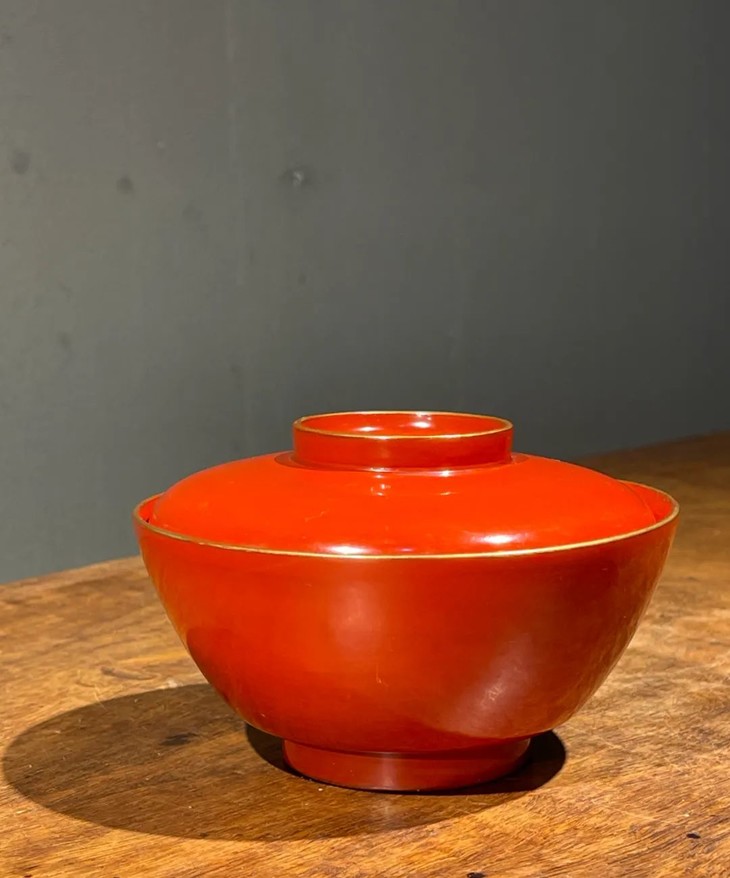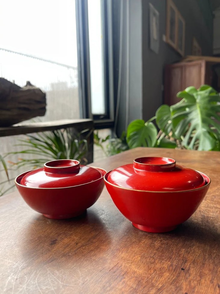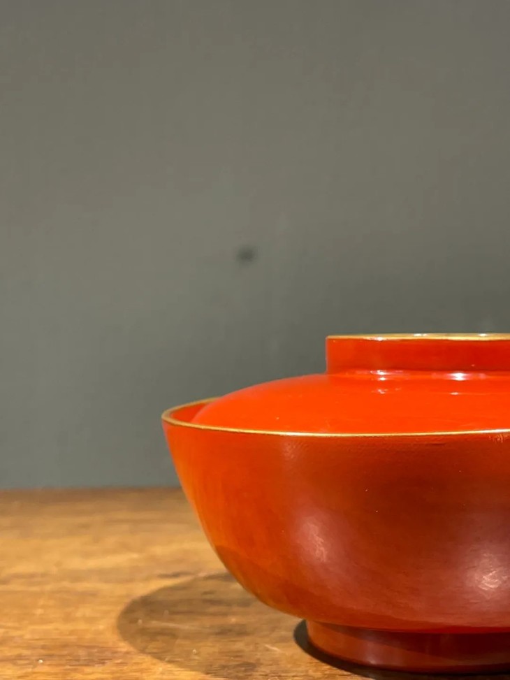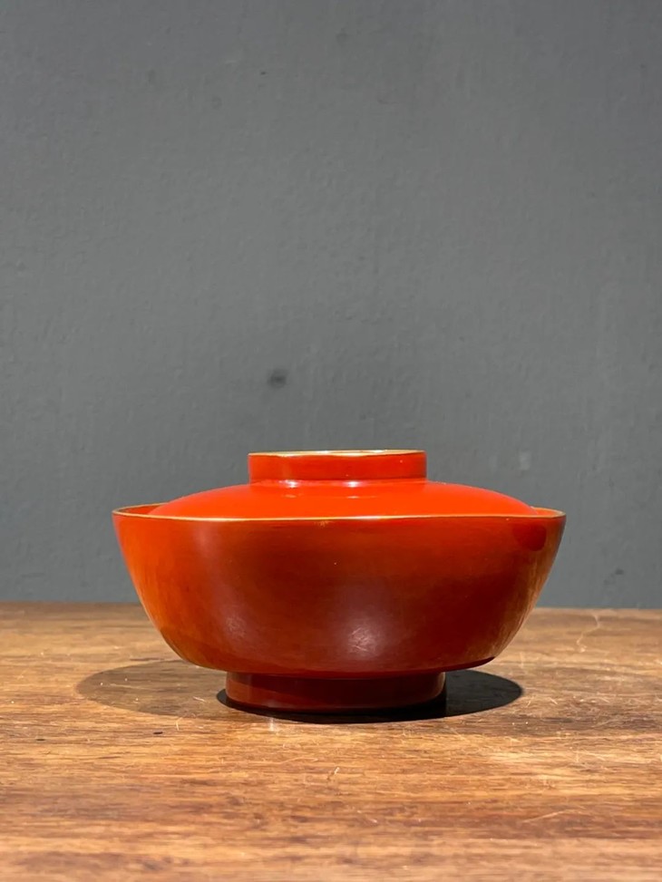 此套朱红大漆金漆沿盖碗两件套组,设计风格典雅精緻,造型圆融,线条简洁、比例和谐,技艺精湛却不繁复,是典型明治/大正时代的高端大漆作品。