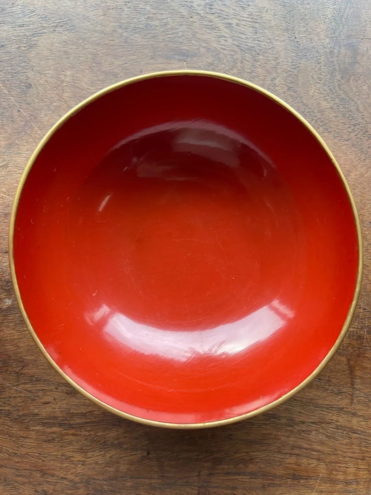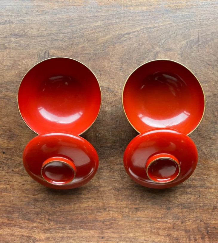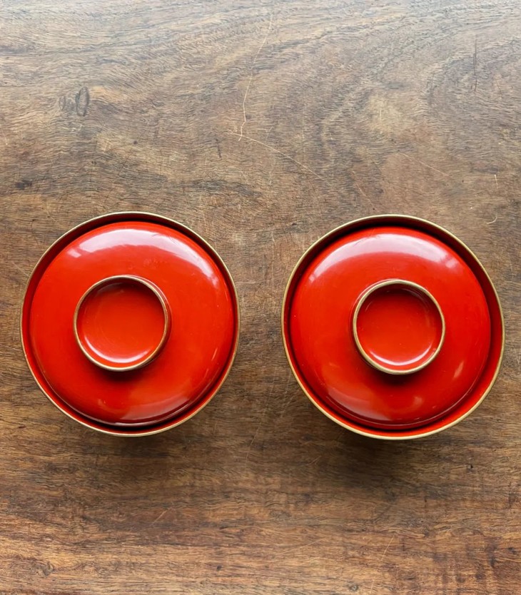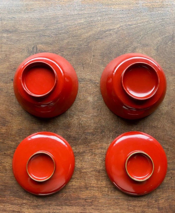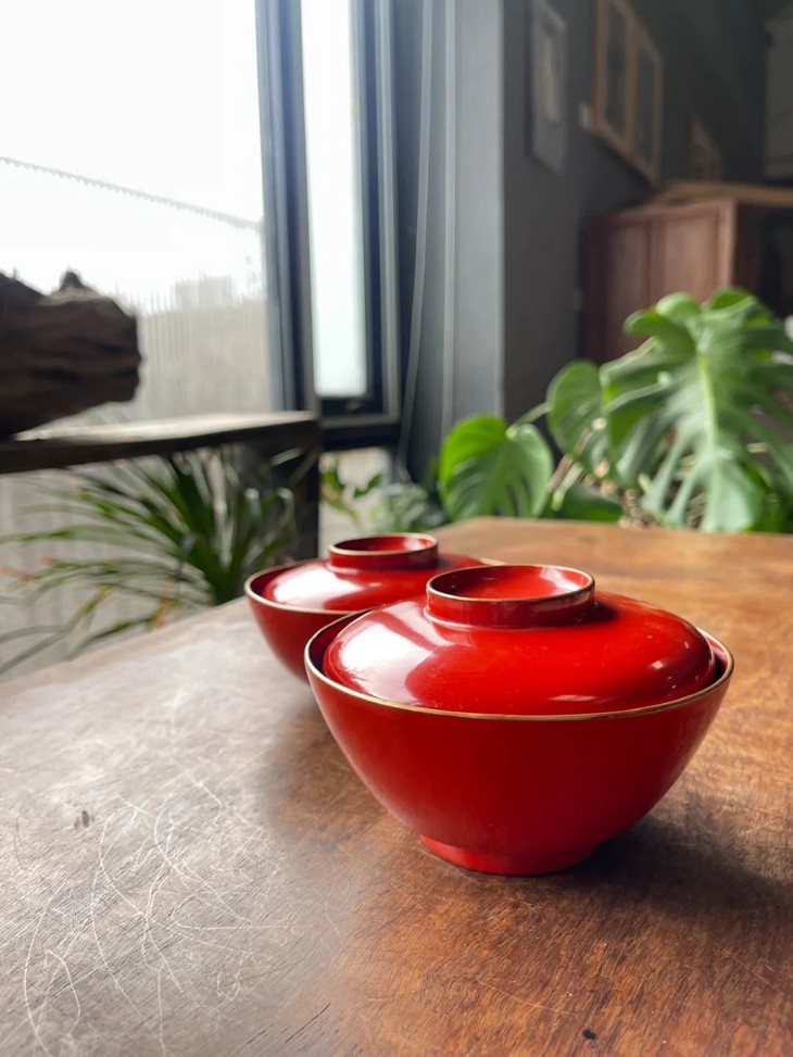 此套朱红大漆金漆沿盖碗两件套组,设计风格典雅精緻,造型圆融,线条简洁、比例和谐,技艺精湛却不繁复,是典型明治/大正时代的高端大漆作品。