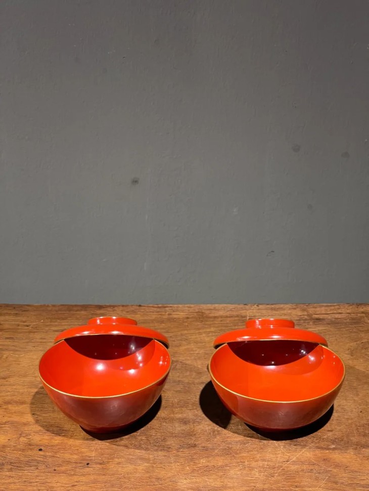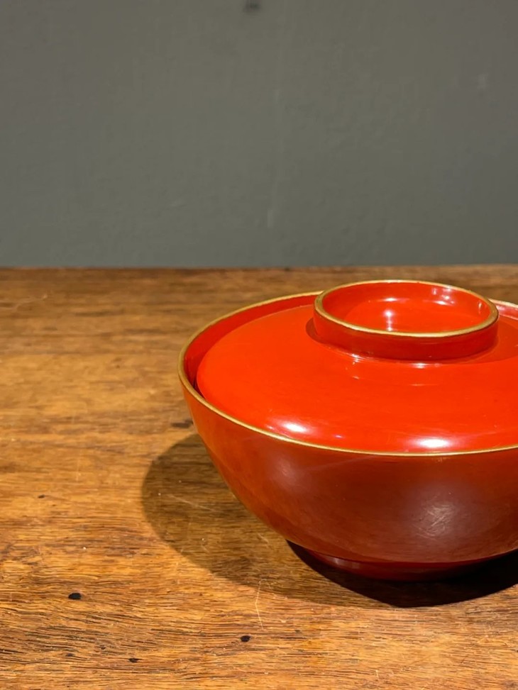 这是一套日本二十世纪初期的精美朱红大漆金漆沿盖碗两件套组,木胎朱红大漆金漆沿带盖圆型盖碗,造型简约大气,朱红加金箔色泽艳丽高雅,整体风格贵气优美,典雅大气,是日本二十世纪初大正时期的高端漆器,是貴族餐器中的“吸物碗”,也就是餐席用于盛汤的盖碗。