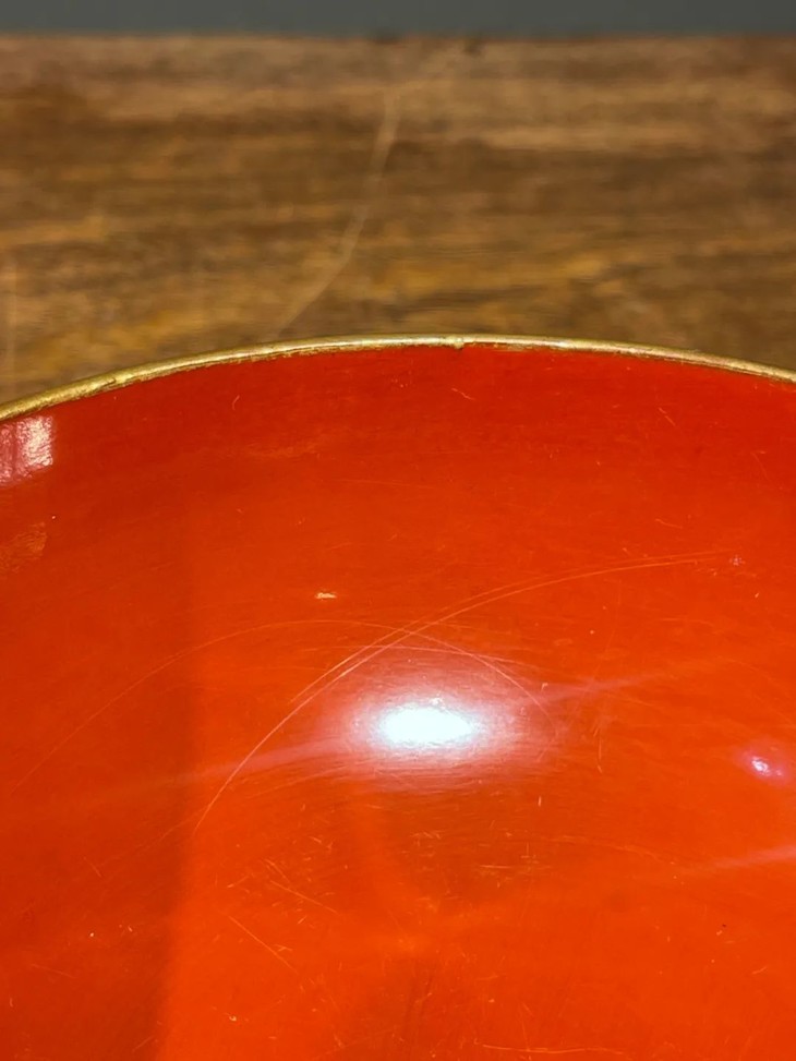 此朱红大漆金漆沿盖碗两件套组,如图所示,除边沿处有些细微掉金漆,以及细微刮痕外,基本保存完好,漆表面靓丽良好。